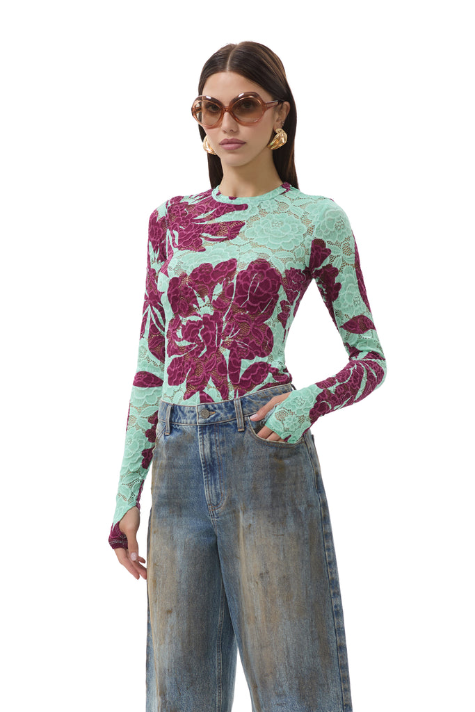 A new take on the best-selling Kaylee top. Introducing one of our most sold styles now available in a printed lace fabrication. Featuring a crew neck and street-style thumbholes that lend an edgy update to off duty style. She comes in Aqua Tropical.