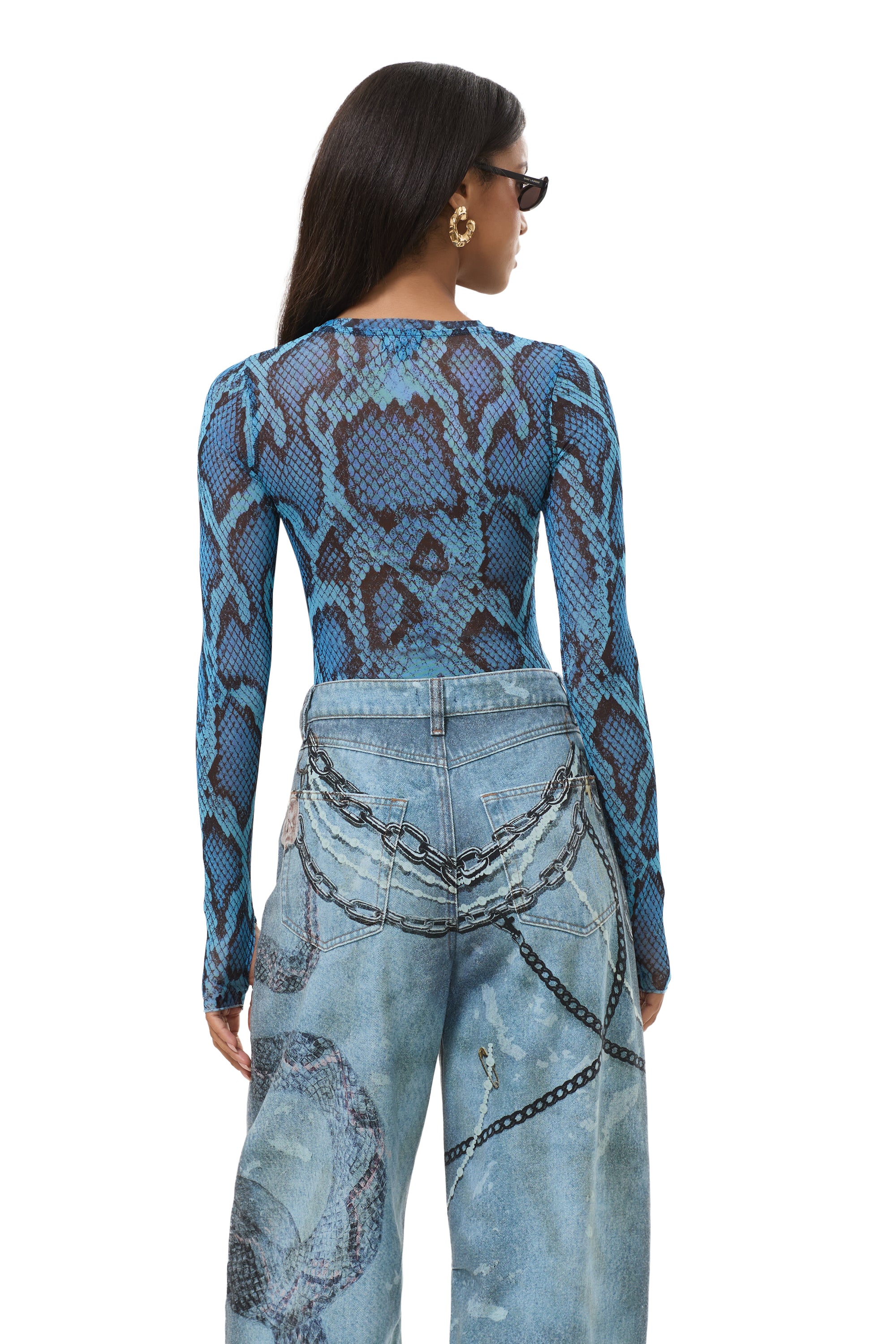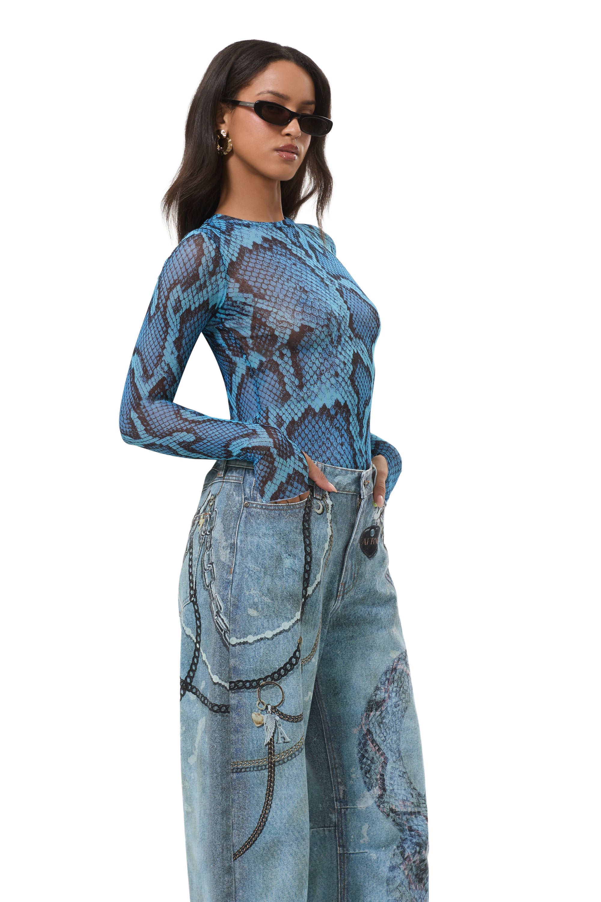 The Kaylee top features a sheer mesh material, crew neck and street-style thumbholes that lend an edgy update to off-duty style. She comes in Blue Fish Snake.