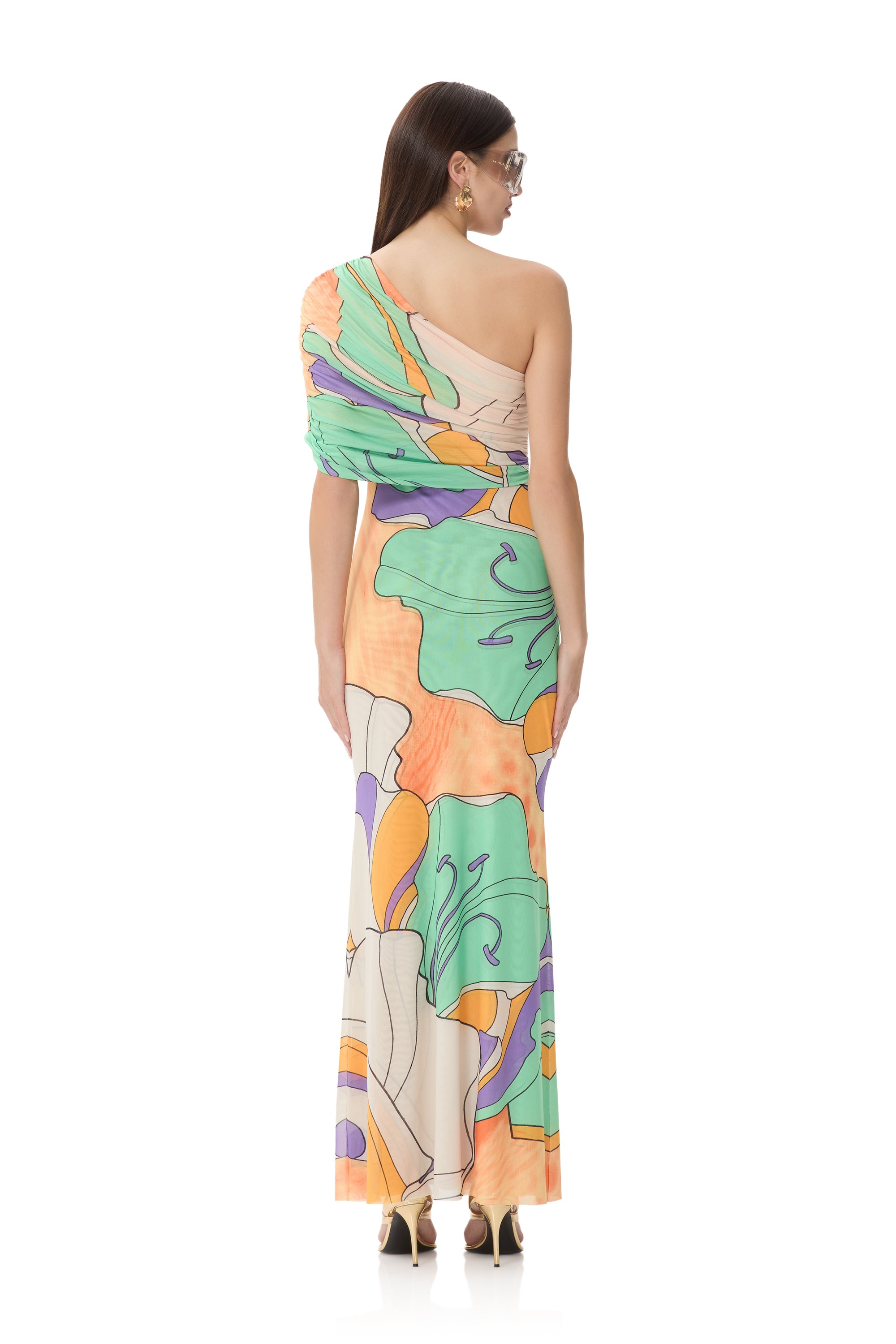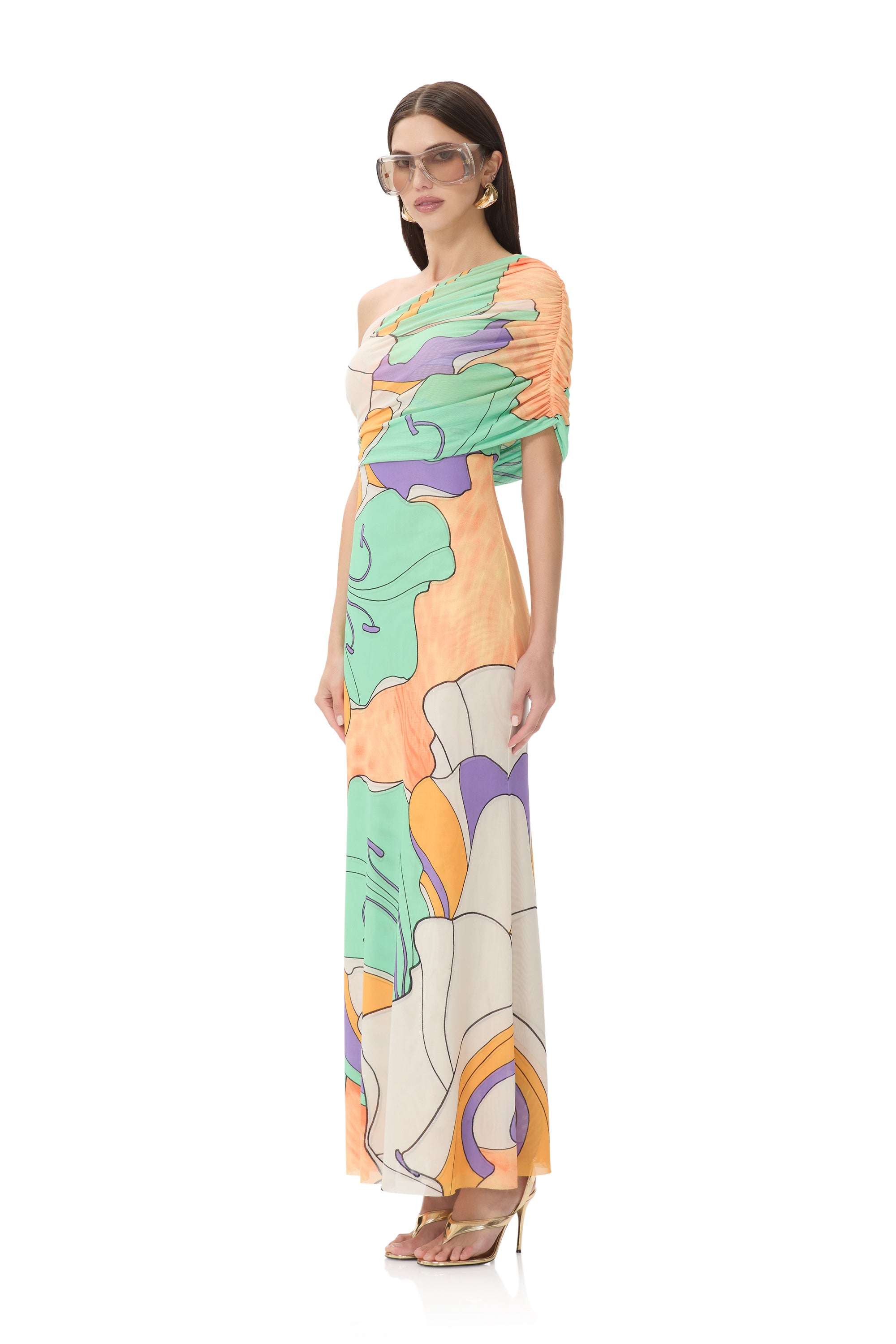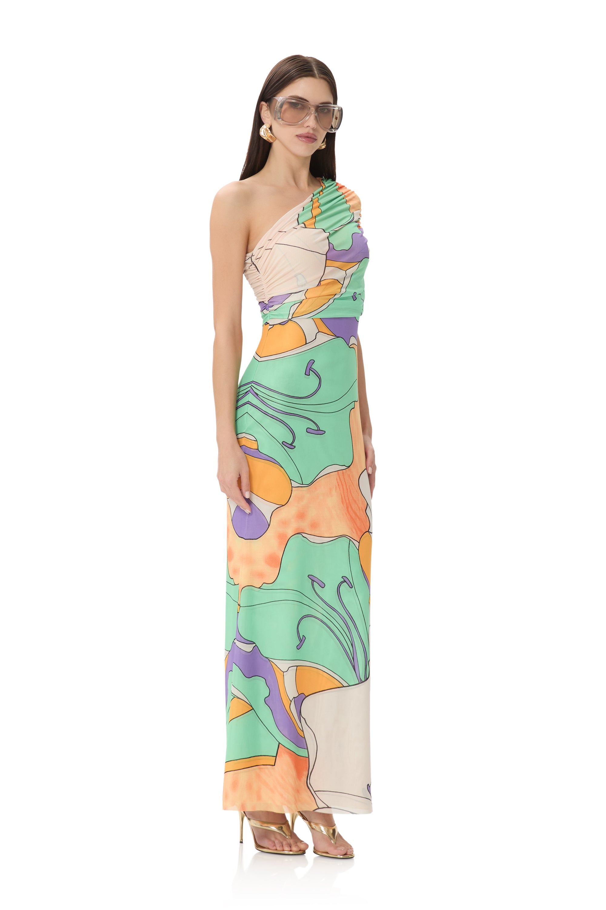 A bold new silhouette destined for icon status, introducing the Mirabel. Defined by its asymmetrical one shoulder neckline and delicate draping shoulder detail, this fluid maxi silhouette makes a bold statement in our vibrant Scarf Floral placement print.