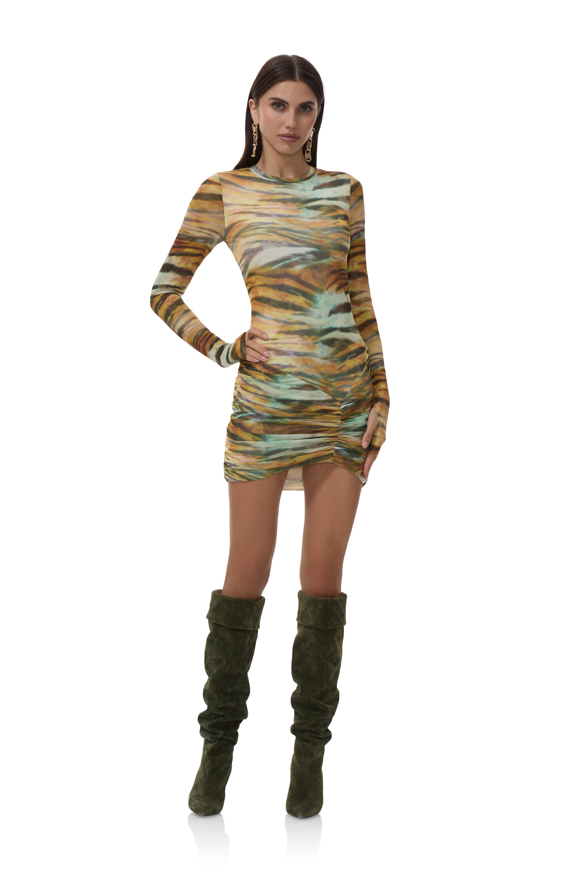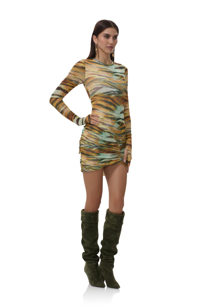 Have a mesh moment with the best selling Mirza crew neck mini dress. This body hugging silhouette finds balance in a sleek fit, drop waist details, and front ruching. She comes in our newest print, Citron Tiger.