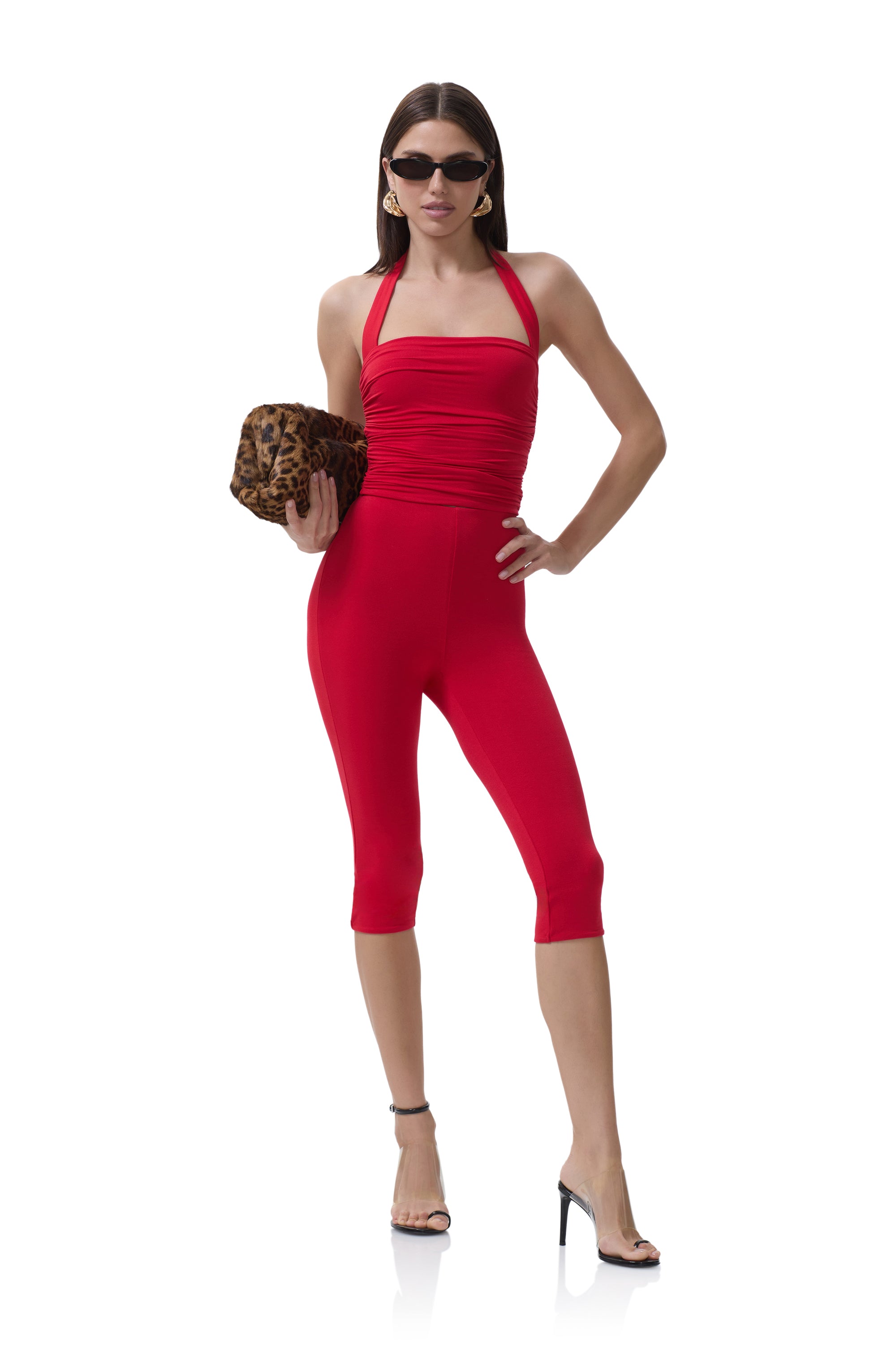 Aranya is made for romance. Designed with a flattering halter neckline and a softly ruched bodice, this top hugs in all the right places for an effortlessly feminine silhouette. Debuting in our all new Kiss Red solid, Aranya is the standout piece of the season, perfectly styled on its own or paired with the matching Ettie Capri Legging for a bold, coordinated look.