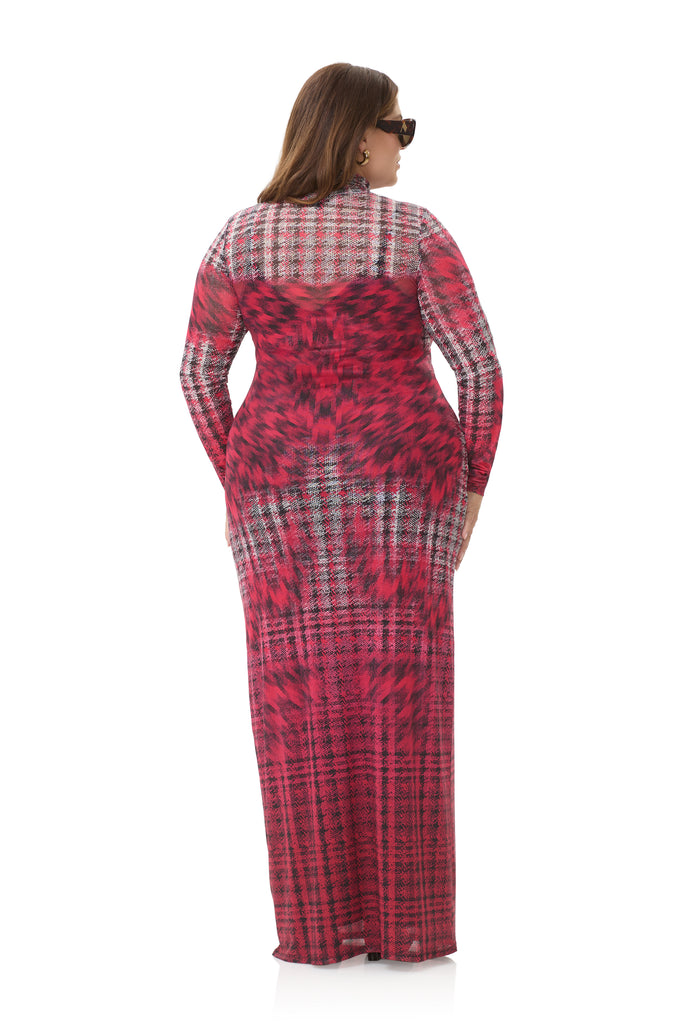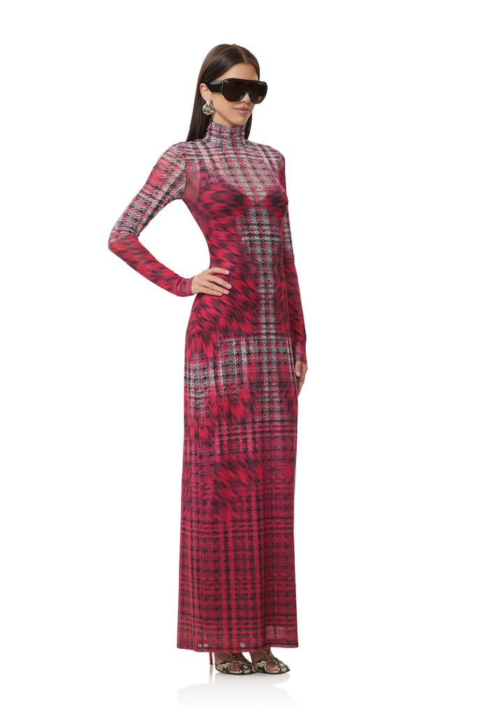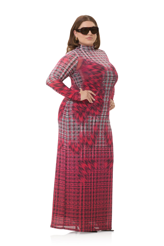 The Billie Dress is back and better than ever. Crafted in sheer power mesh and adorned with our new Ruby Houndstooth print, she’s designed in an effortless column fit with a sleek mock neck and flattering maxi silhouette. A true wardrobe essential, Billie transitions seamlessly from day to night with timeless versatility.
