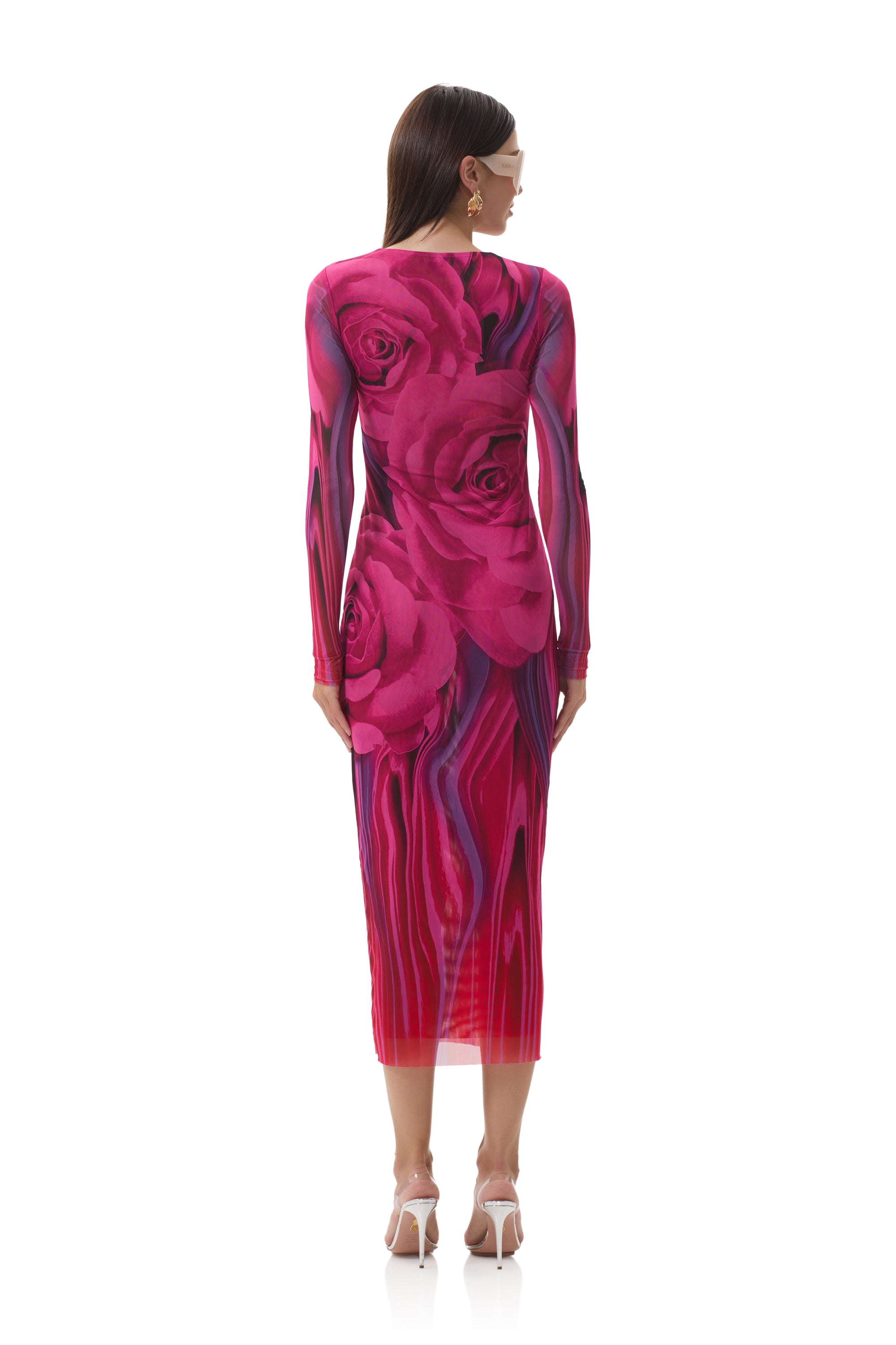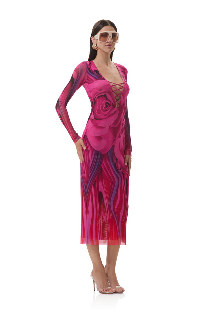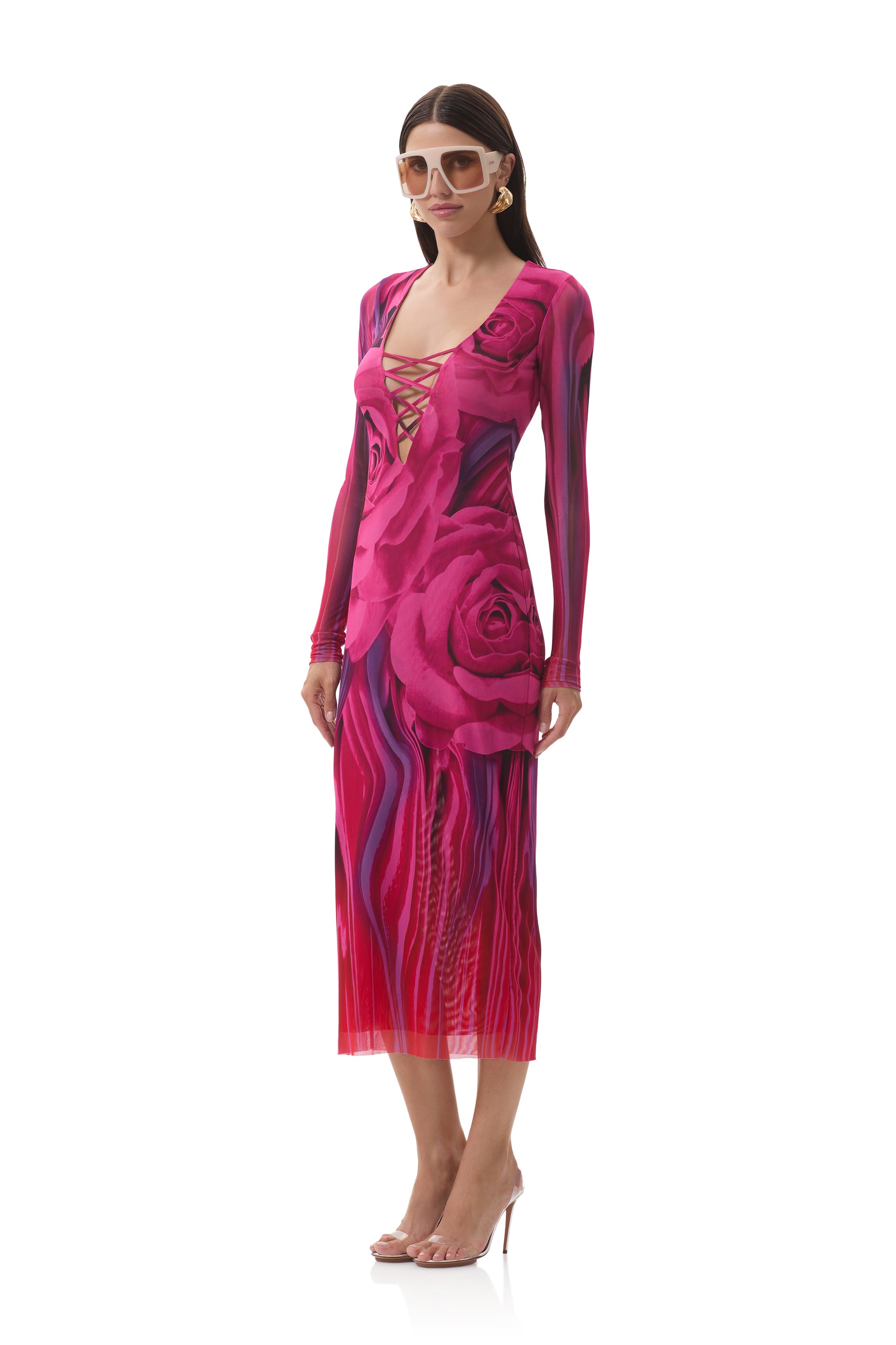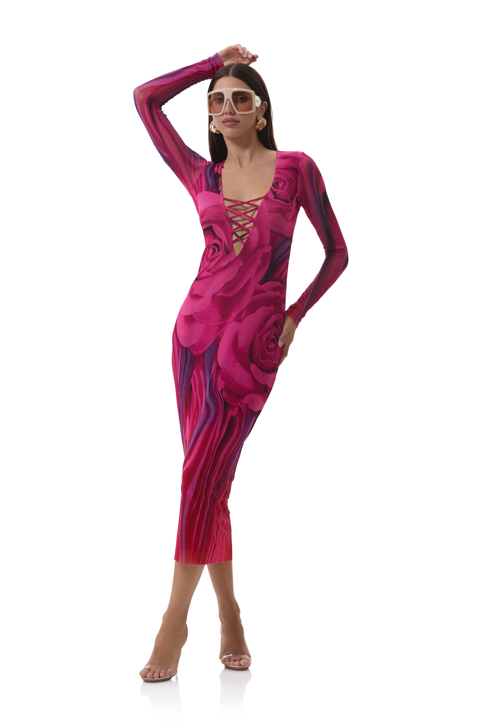 All eyes on the Cambria Dress, the true definition of sexy and chic. Featuring a daring plunge neckline and lace up accents, Cambria redefines sultry sophistication with a modern edge. Now available in our striking new print, Fuchsia Rose.