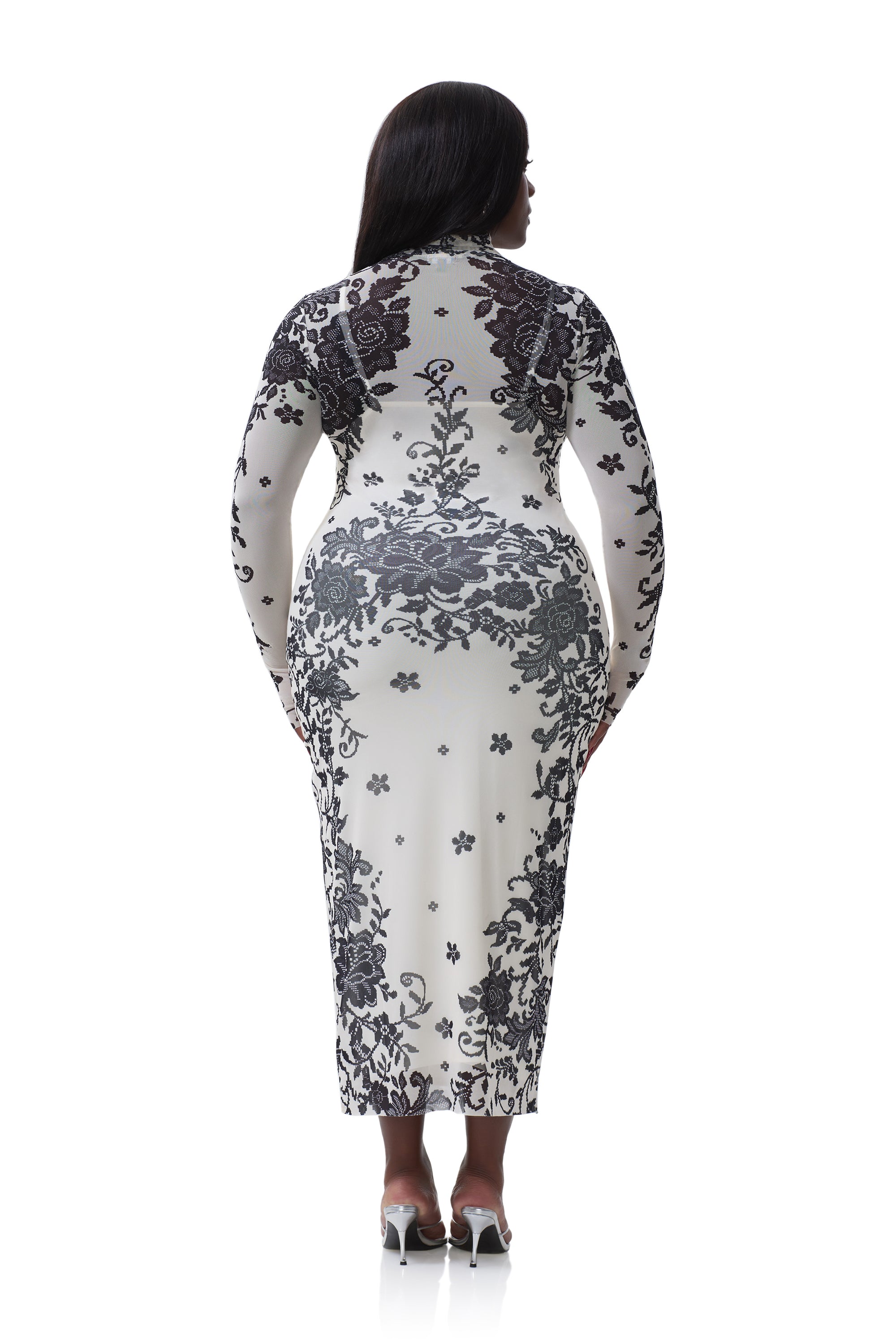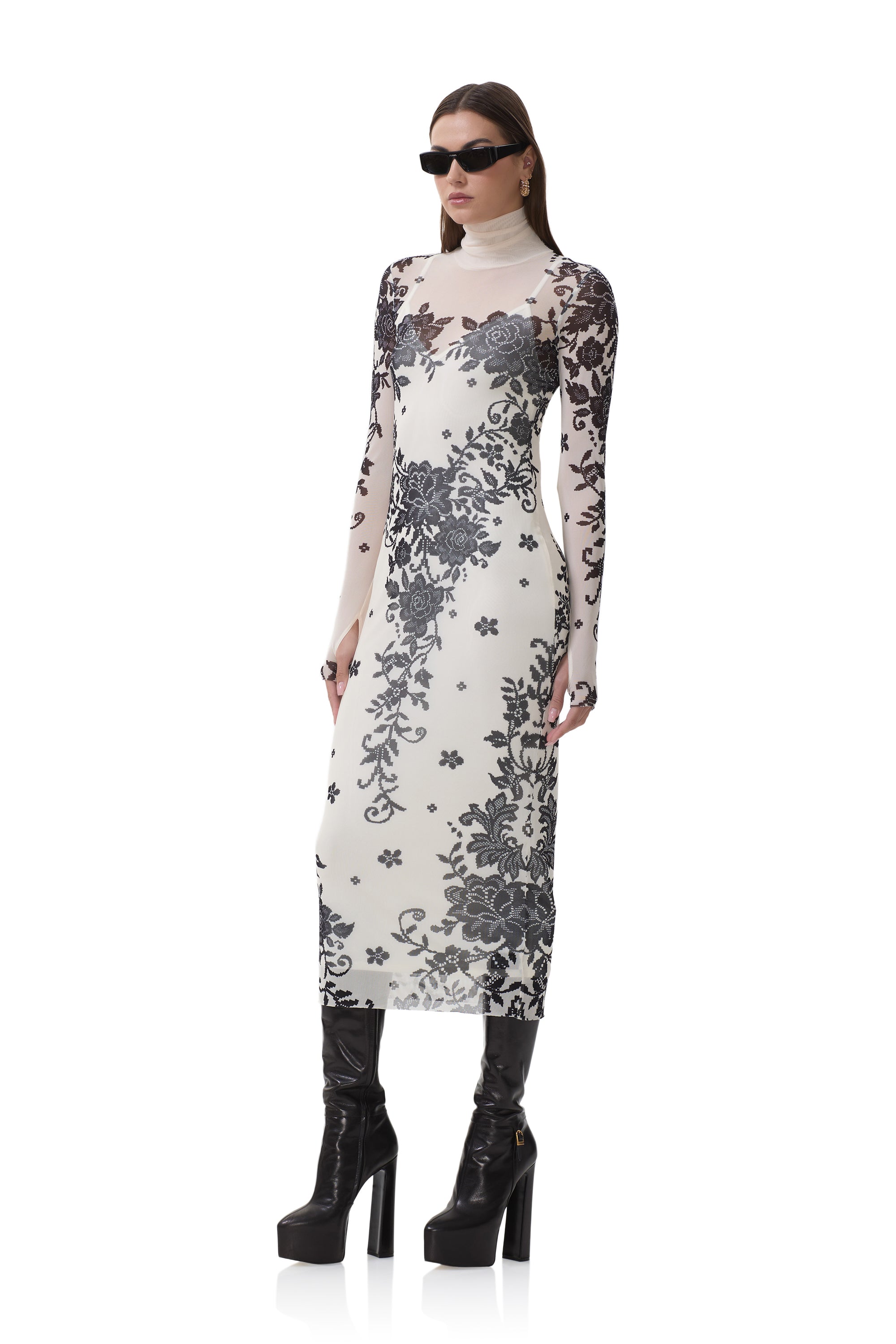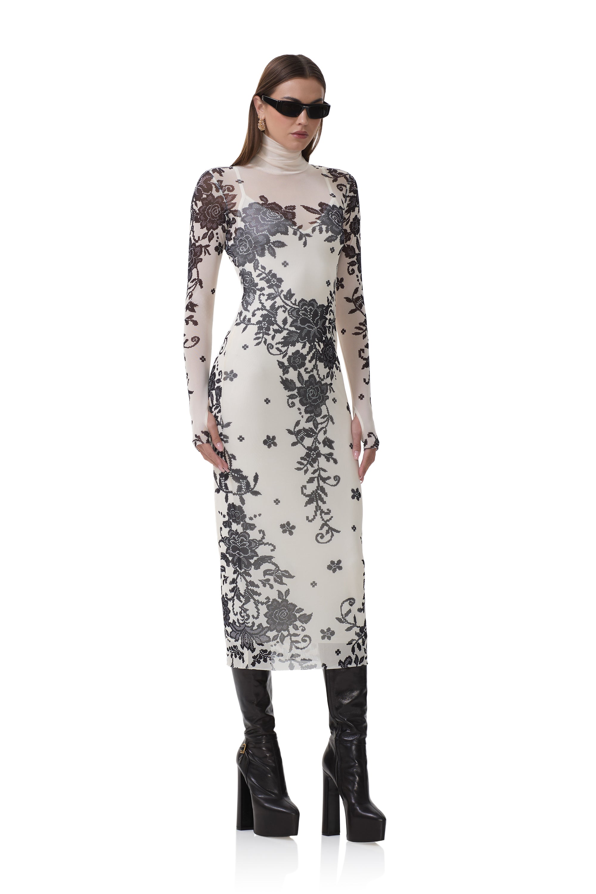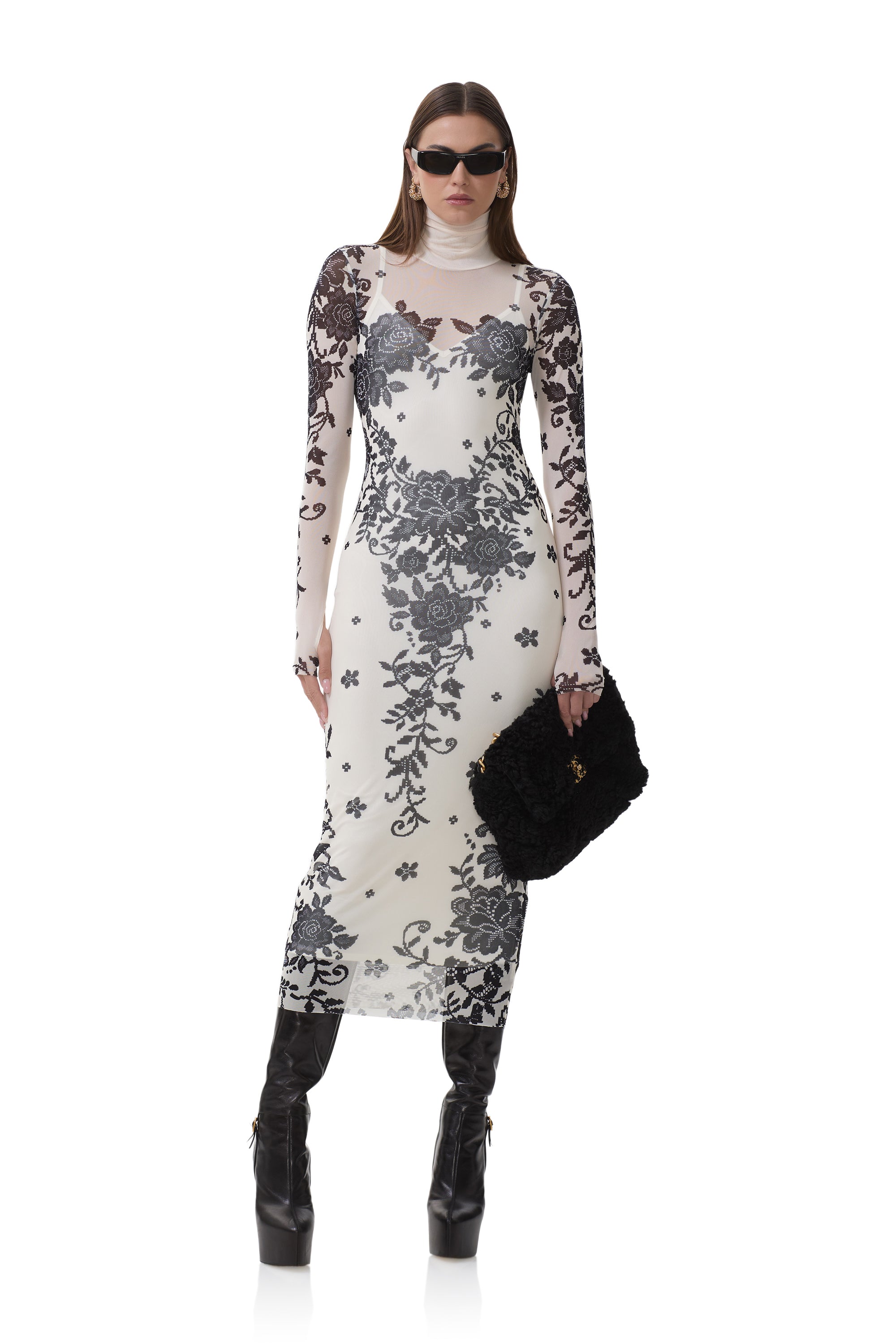 In a sheer power mesh in Stark Lace, the Shailene dress features a turtleneck and fitted midi silhouette. Her sleeve thumbholes add off-duty detail, and she comes in a pullover design that includes a removable slip.