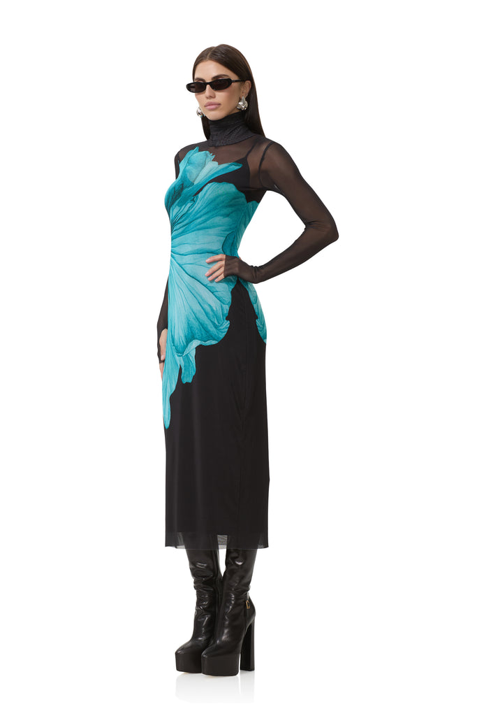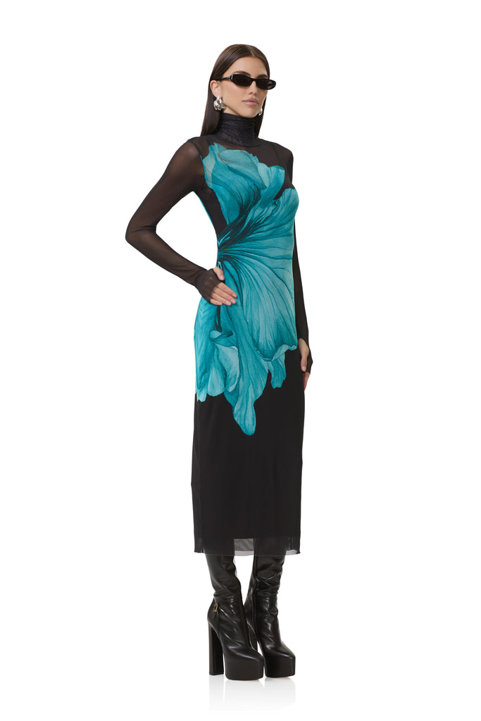 In a sheer power mesh in Teal Flower, the Shailene dress features a turtleneck and fitted midi silhouette. Her sleeve thumbholes add off-duty detail, and she comes in a pullover design that includes a removable slip.