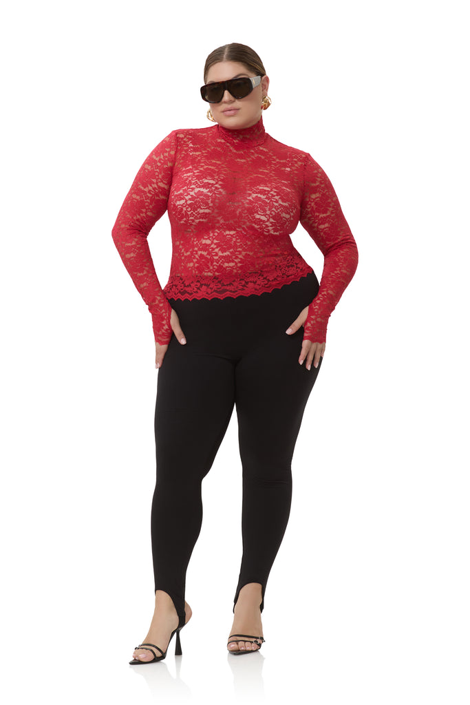 Stay bold throughout the season in the best selling Zadie Top, now designed in our iconic silken lace. Detailed with scallop finish accents, a classic turtleneck, and edgy thumbhole sleeves, she’s the perfect blend of glam and street style. Available in Poppy Red.
