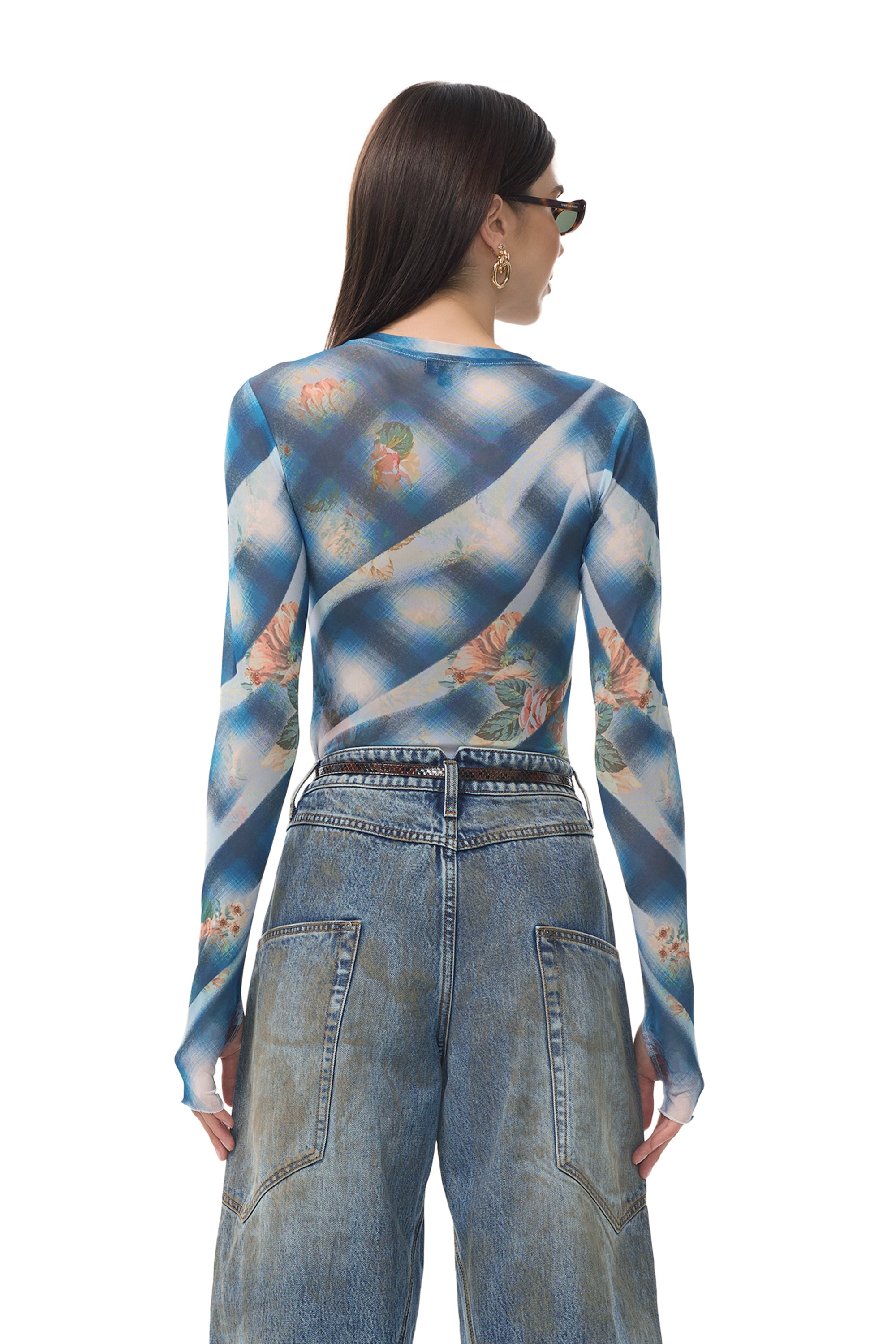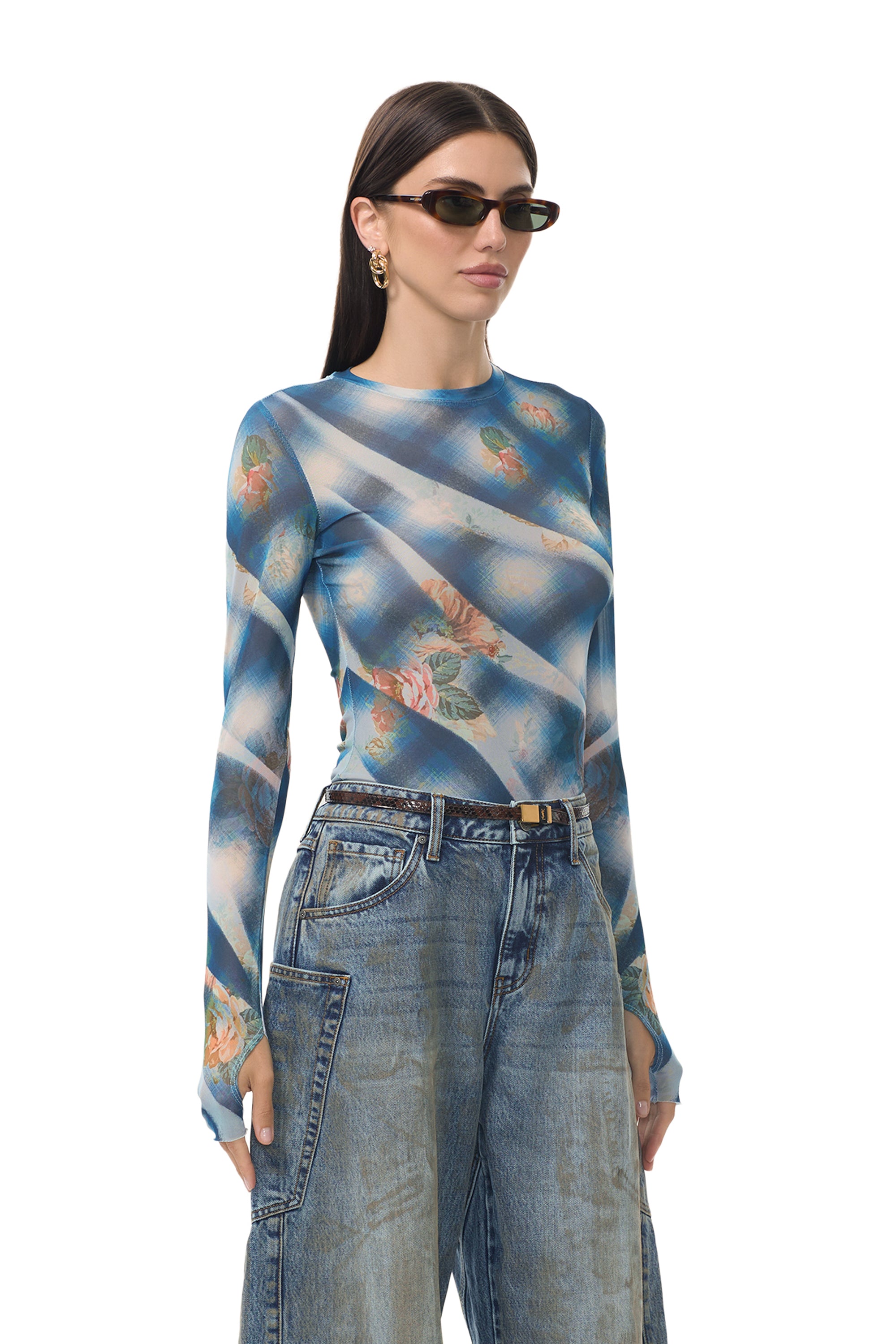 The Kaylee top features a sheer mesh material, crew neck and street-style thumbholes that lend an edgy update to off-duty style. She comes in Blue Floral Plaid.