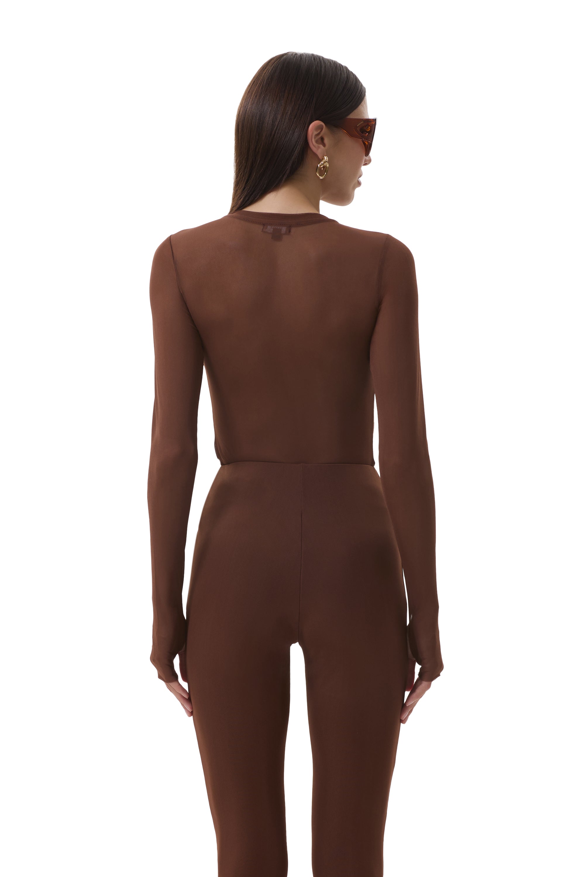 The Kaylee top features a sheer mesh material, crew neck and street-style thumbholes that lend an edgy update to off-duty style. She comes in Cappuccino.