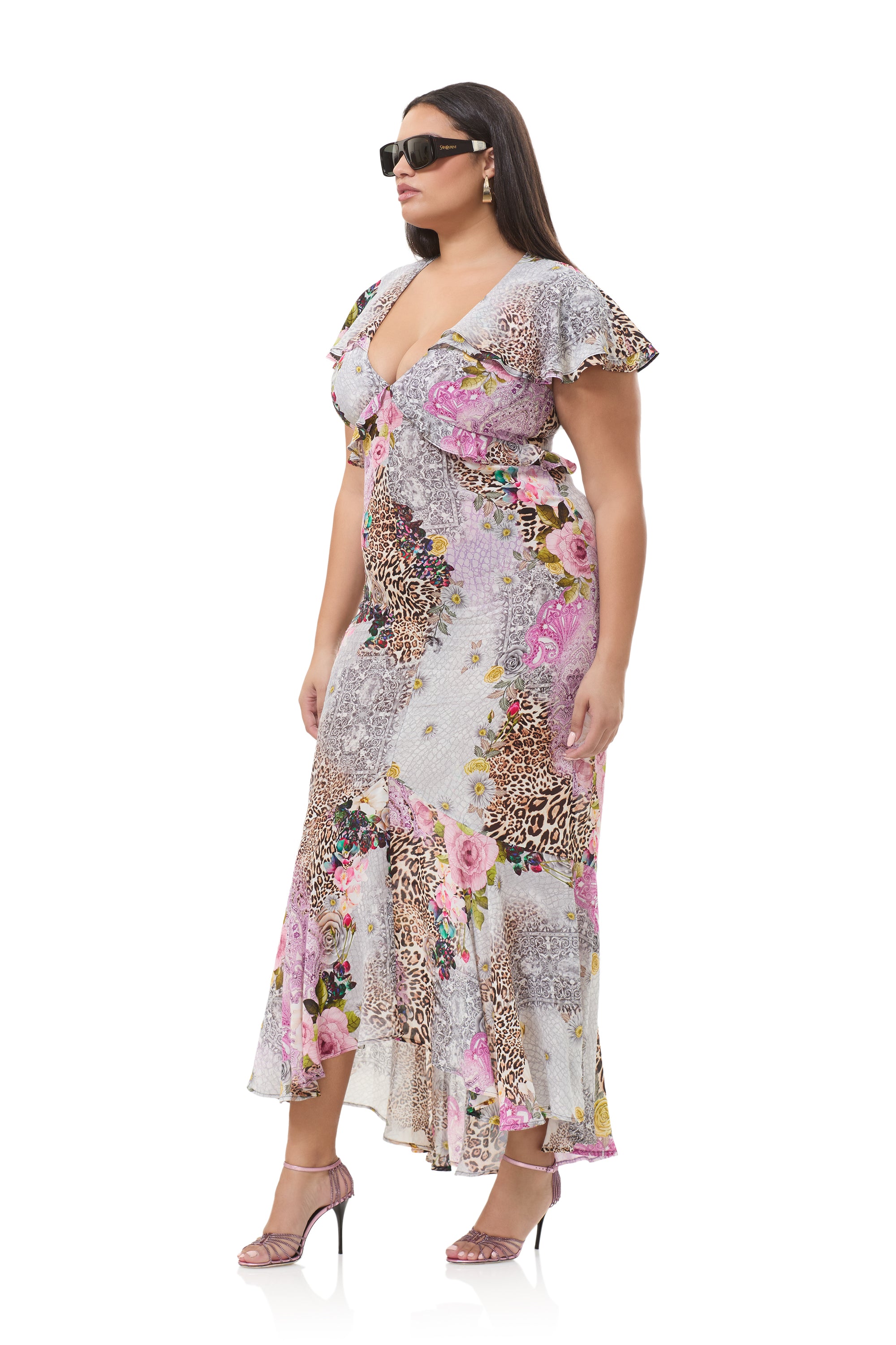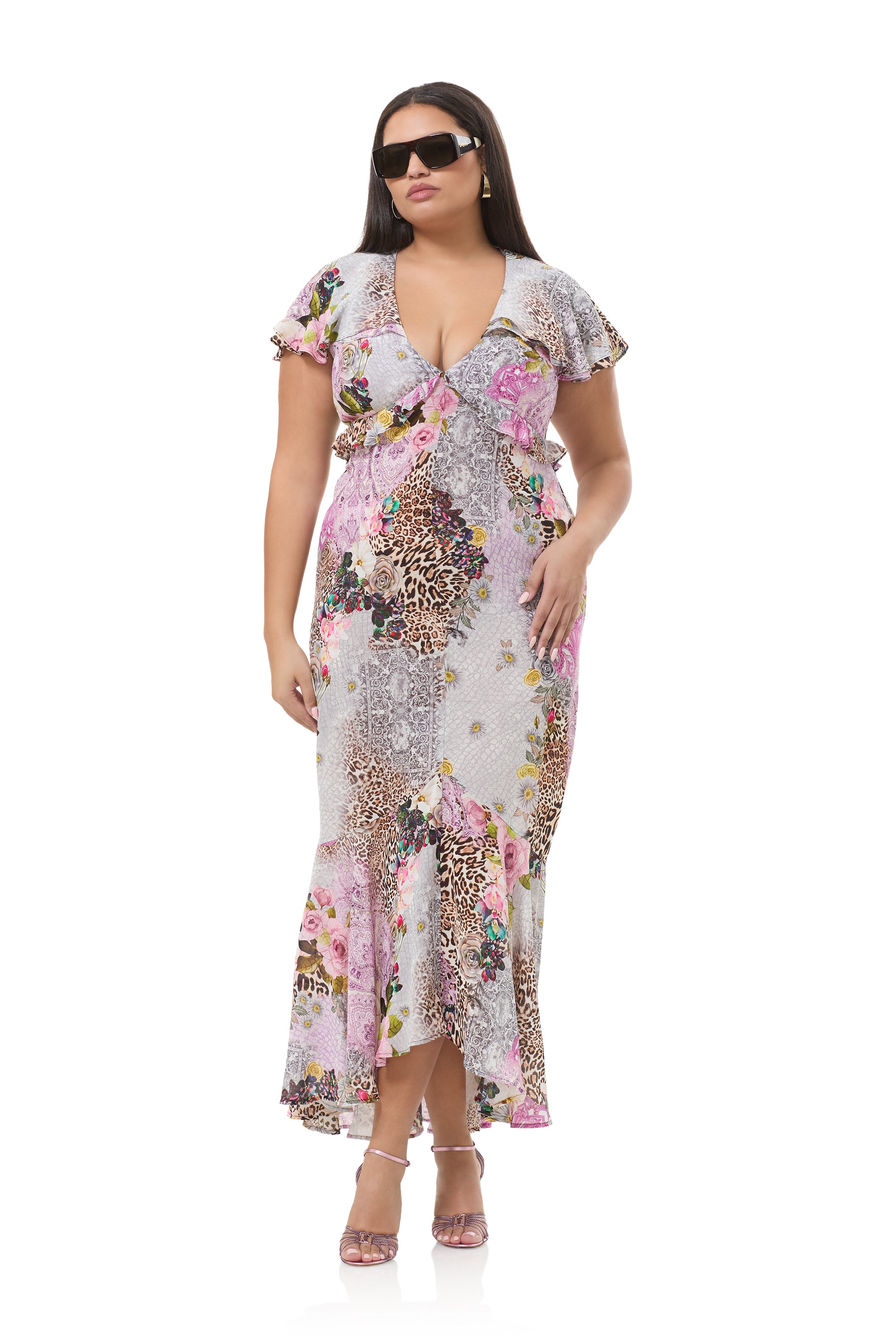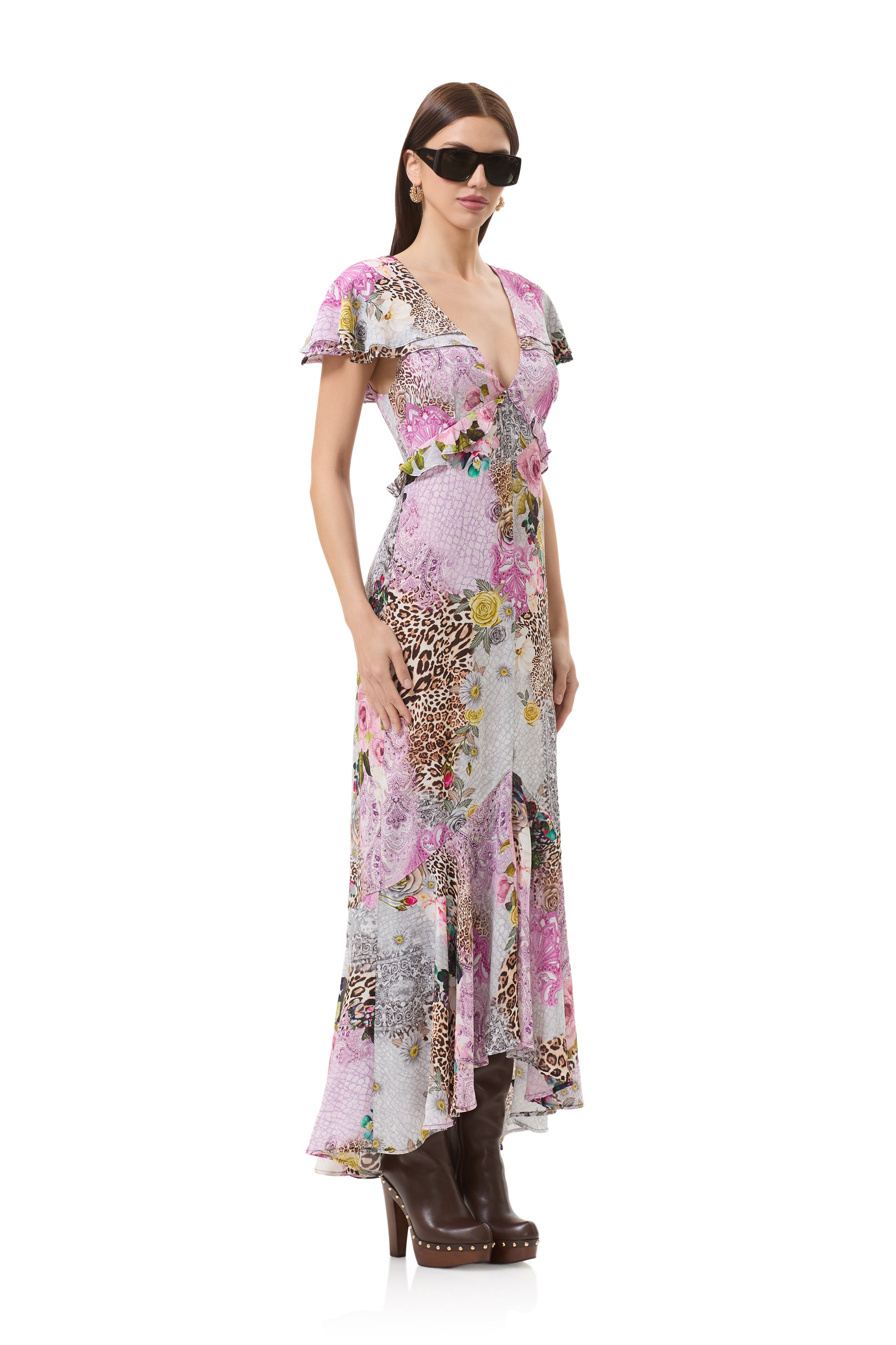 Romantic with a bold edge, the Hemant Dress has made an entrance. This flutter sleeve high low maxi dress is designed with a deep V neckline that adds just the right amount of drama. This silhouette is softened with femme ruffle details that move beautifully with every step, effortless yet statement-making, this dress is made for moments that call for something unforgettable.