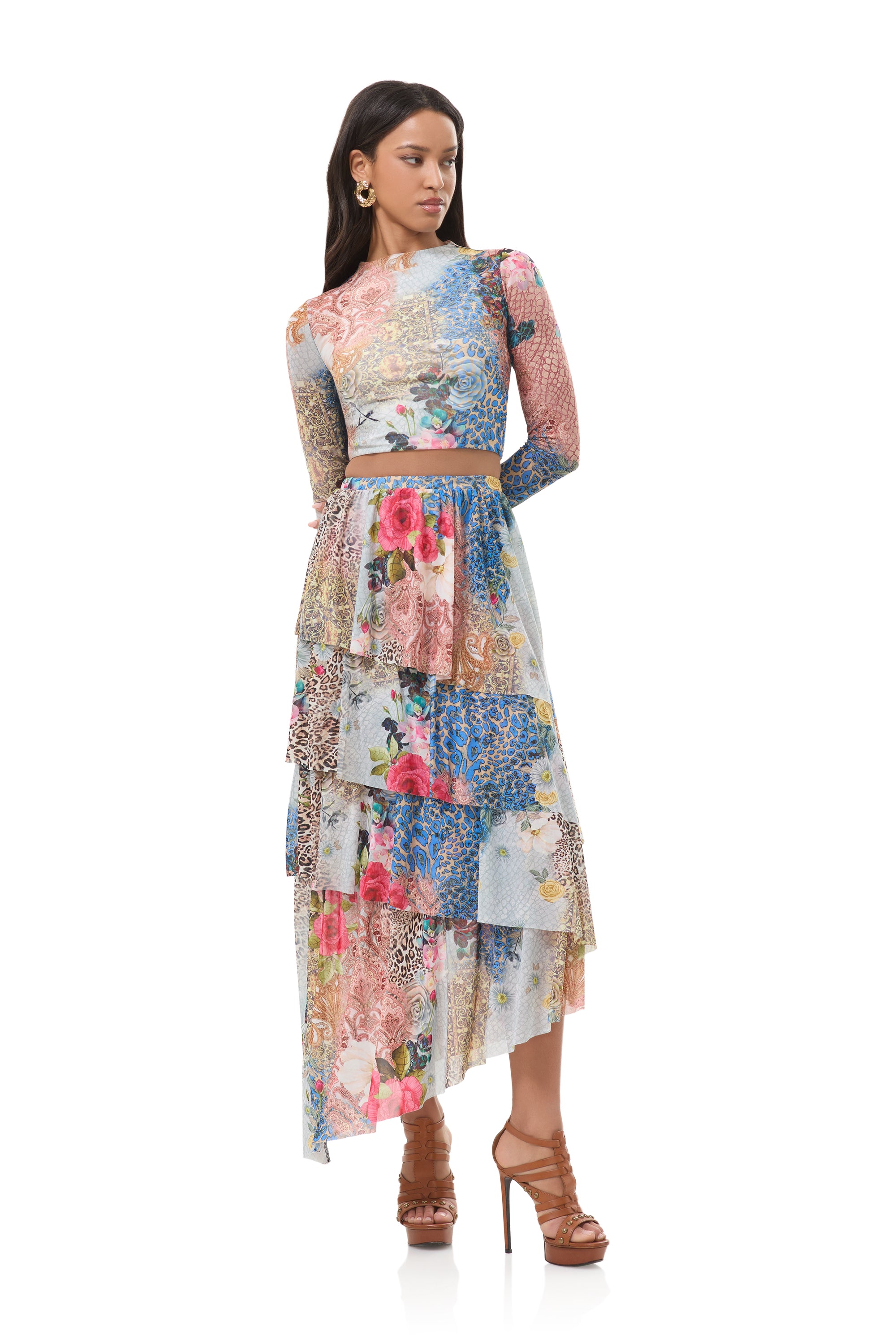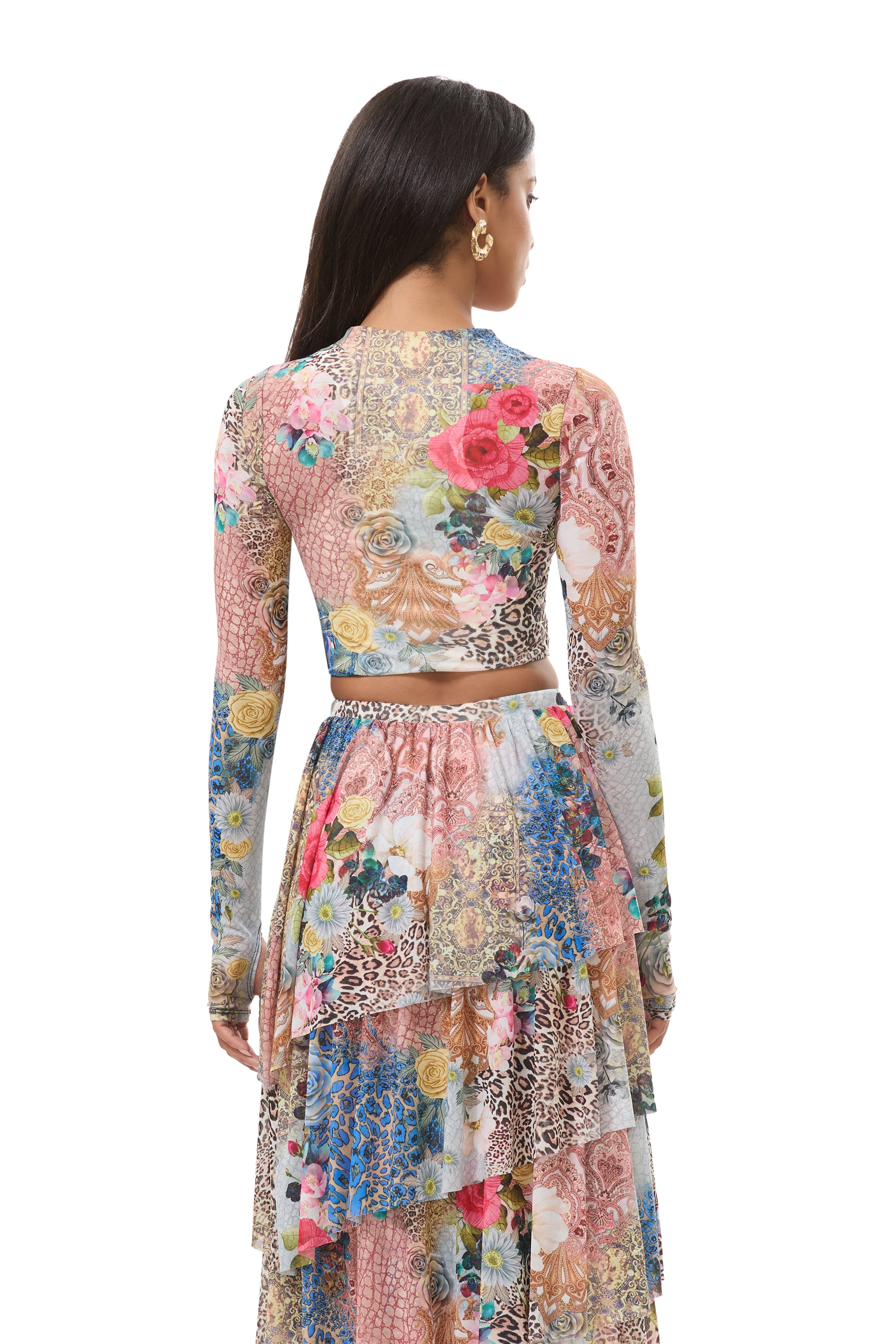 Meet Loralei, the ultimate cropped power mesh top. Designed with our best selling funnel neckline, long sleeves, and our signature street style thumb holes, she creates a confident, streamlined silhouette. Style with the matching Brandy Skirt in Iris Patchwork for a fully coordinated look.