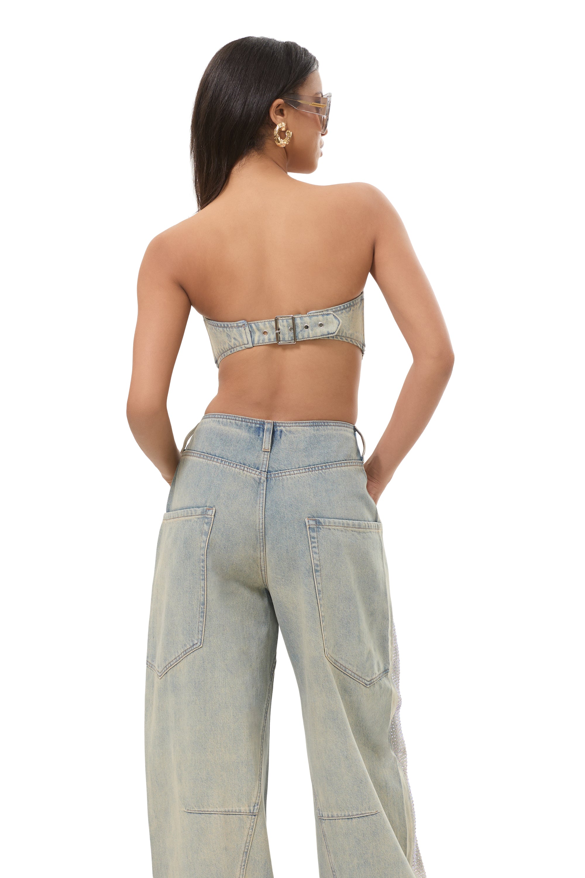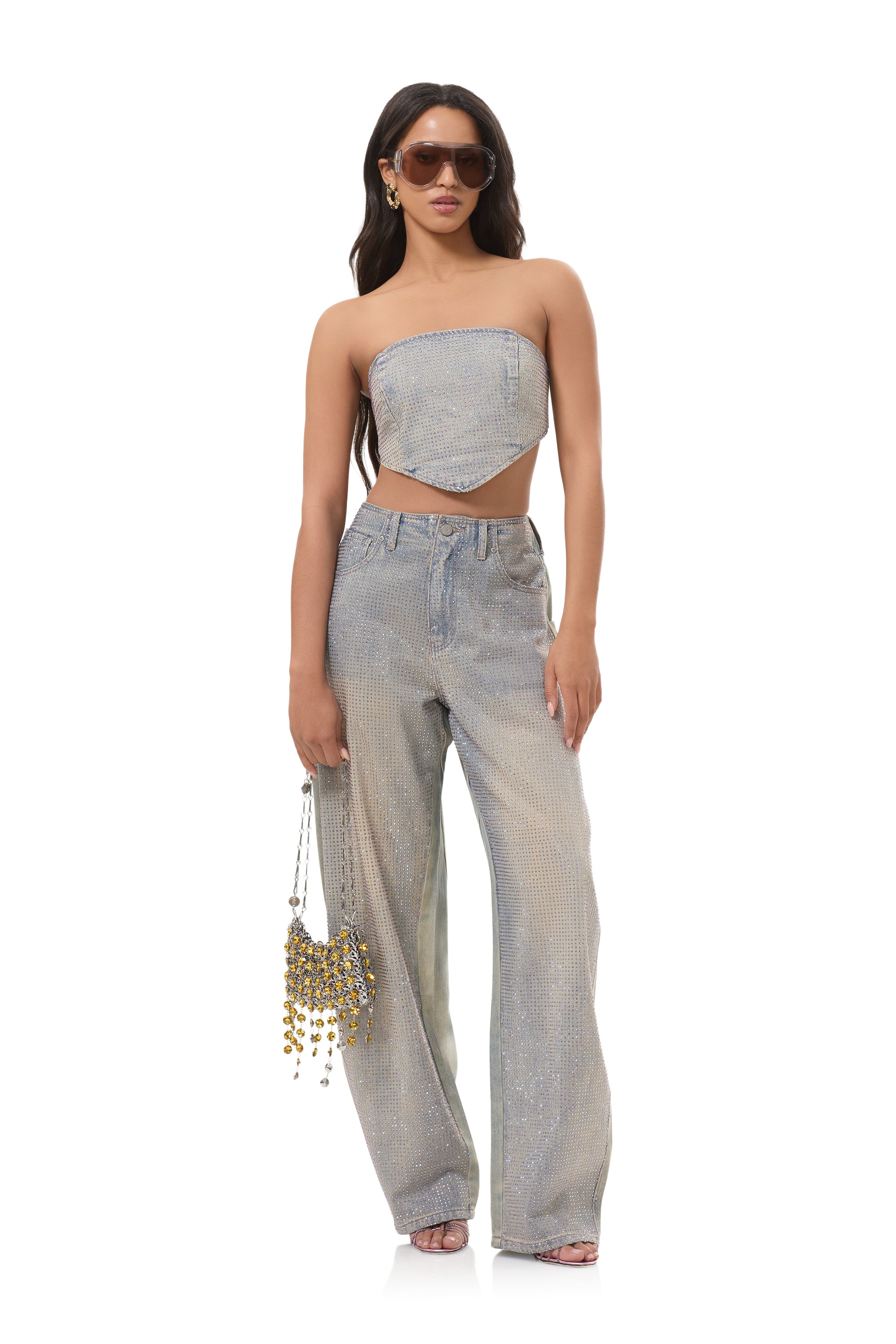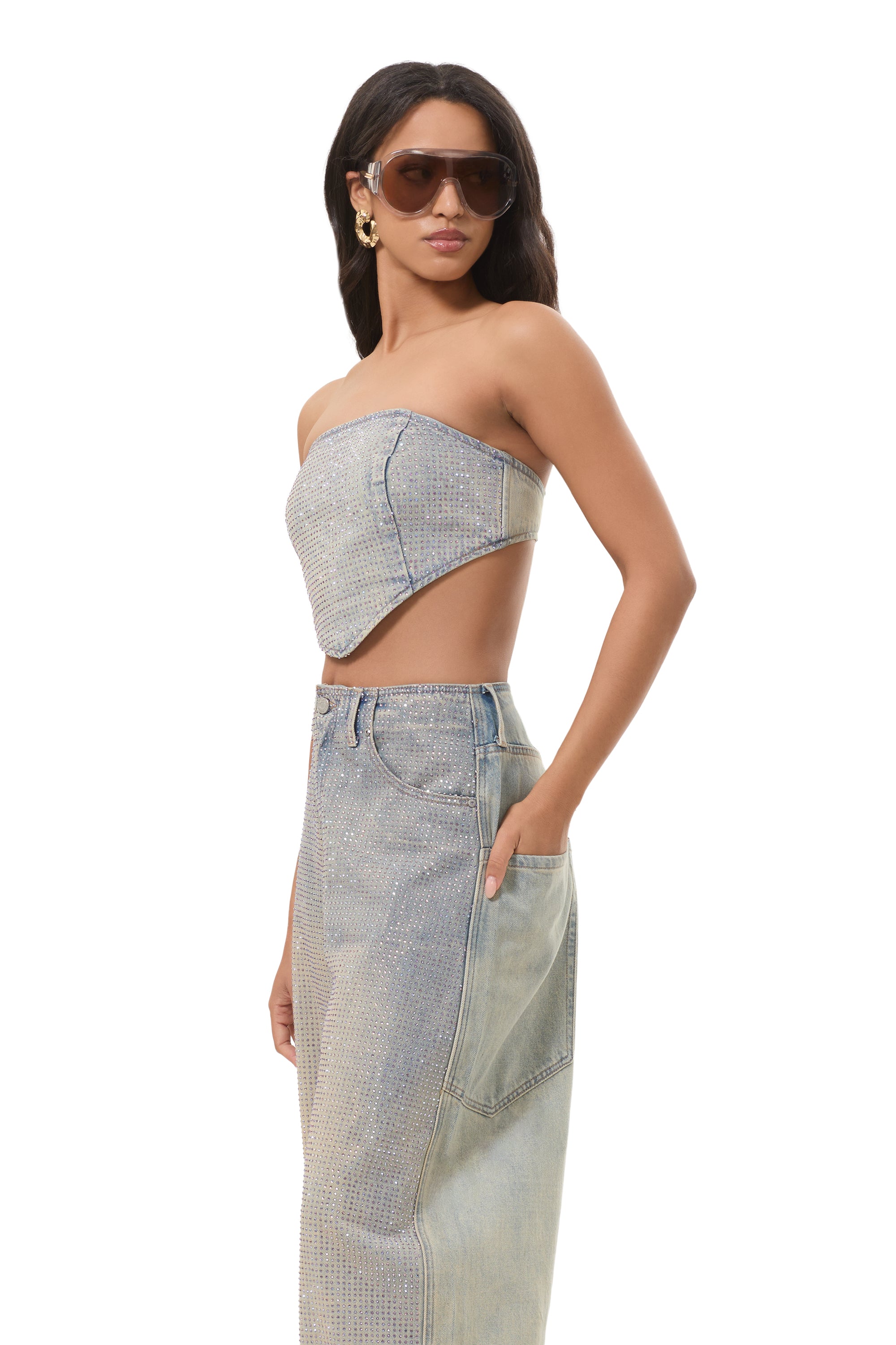 The Sonoma Rhinestone Top delivers high impact shine in a sleek, scarf inspired silhouette. Designed with all over iridescent rhinestones, it catches the light from every angle for a luminous, statement making finish. Equal parts glam and effortless, Sonoma is made to stand alone, or be paired with the matching Prescott Rhinestone Pant.
