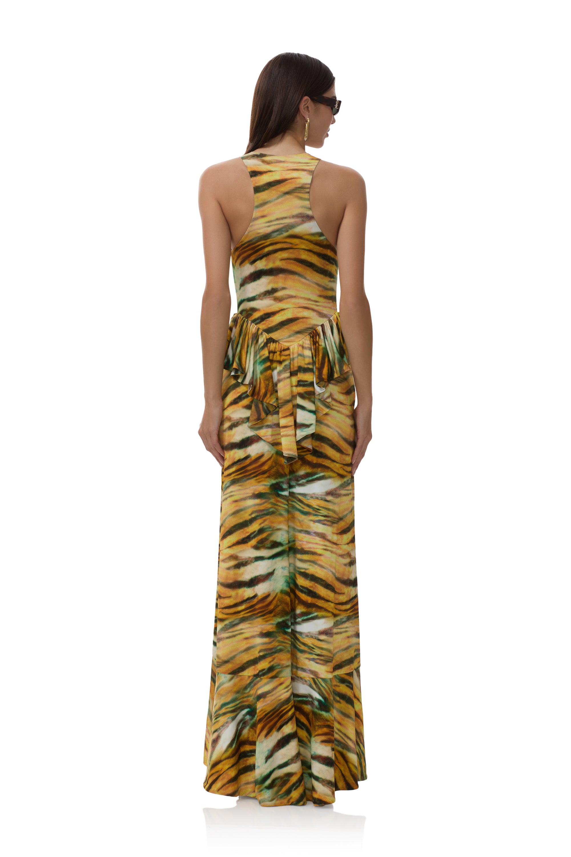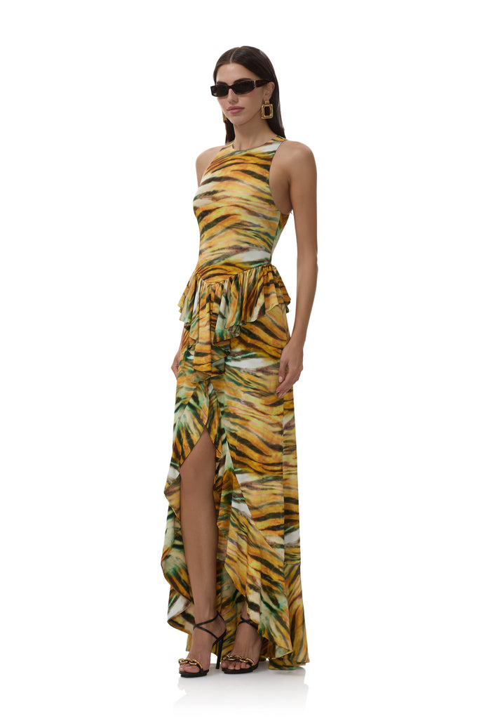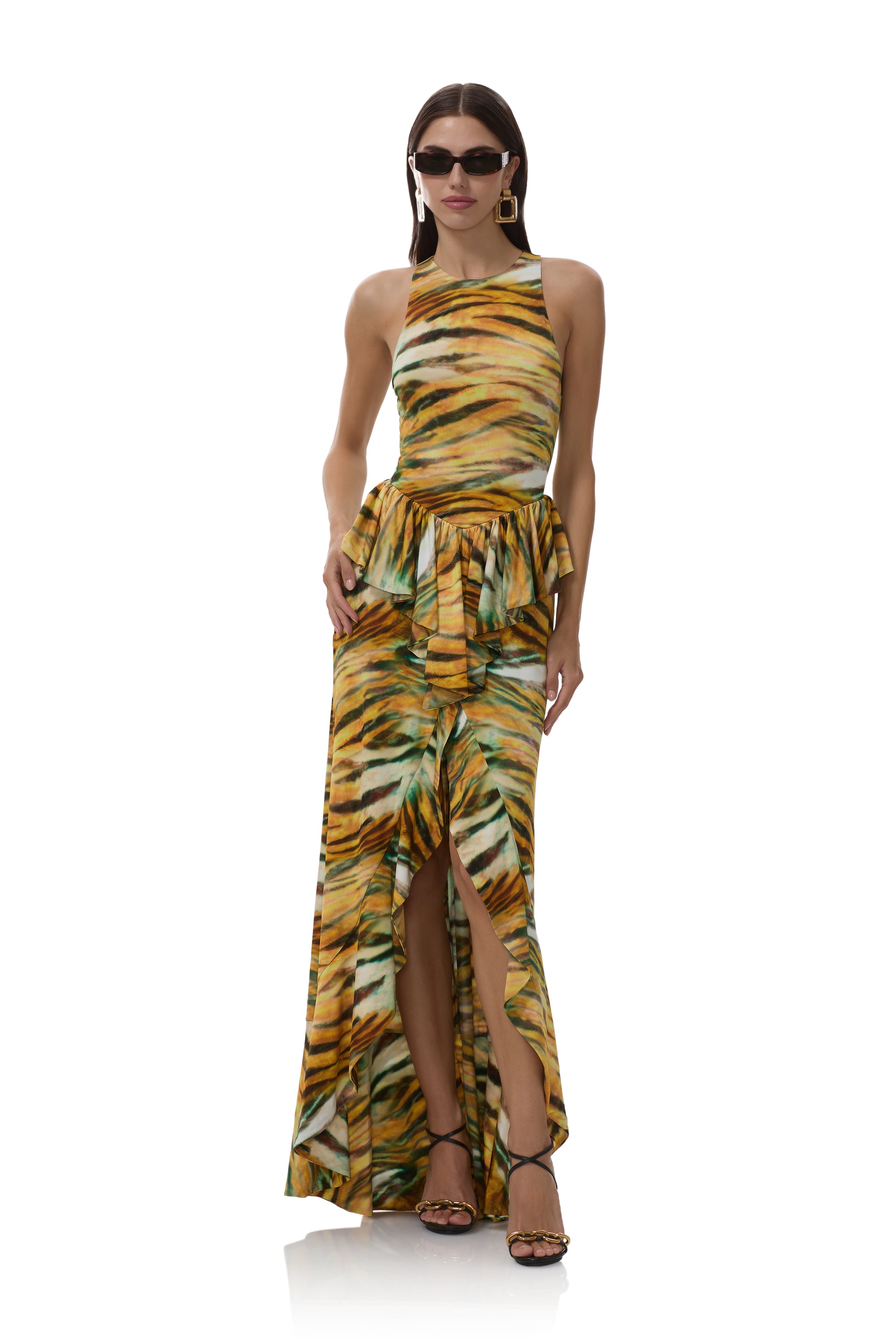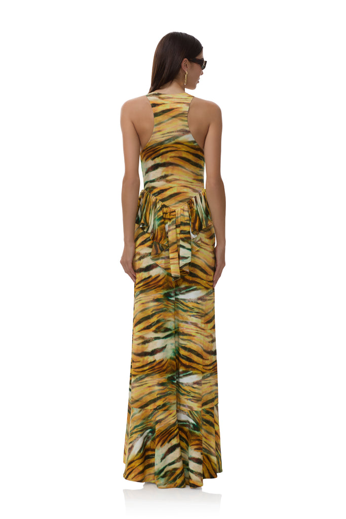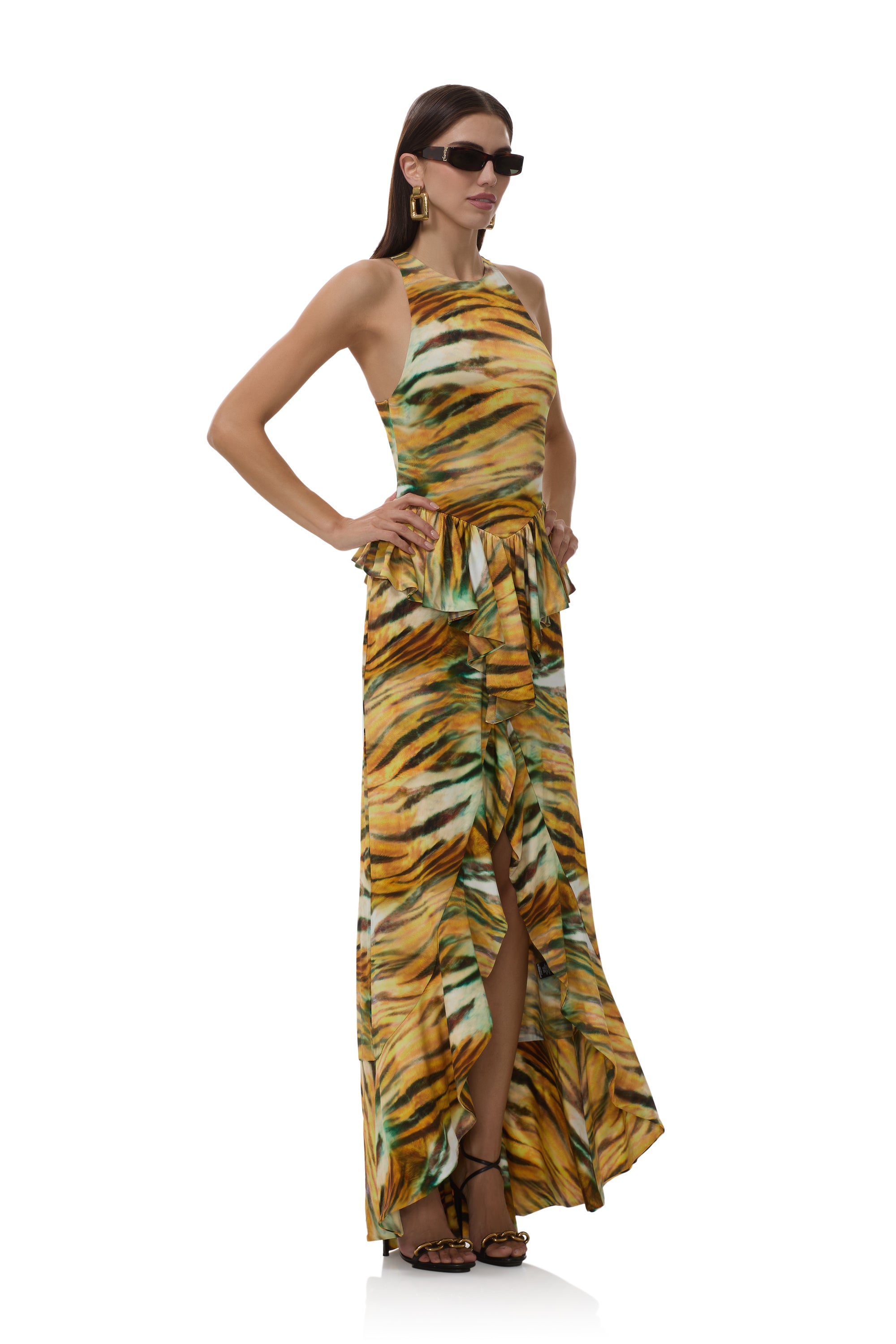 Bovina is back and reimagined in our best selling shiny knit fabrication. Designed with a high neckline, a flowing high low hem, and soft ruffle details, this dress brings a touch of romance to every wear and a feminine silhouette made for your most effortless moments this season.
