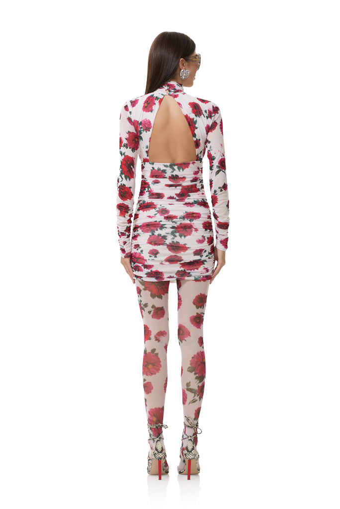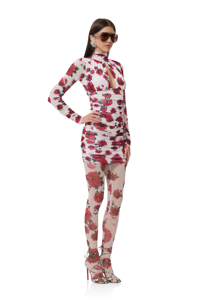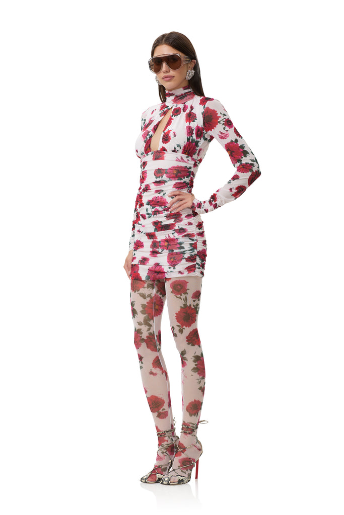 Meet the Eilya Dress. She's short, sleek, and made to turn heads. Featuring a daring plunging cutout, mock neckline, and flattering front and back ruching, she’s the ultimate statement piece for your next night out. She comes in our newest print, Ivory Painted Roses.