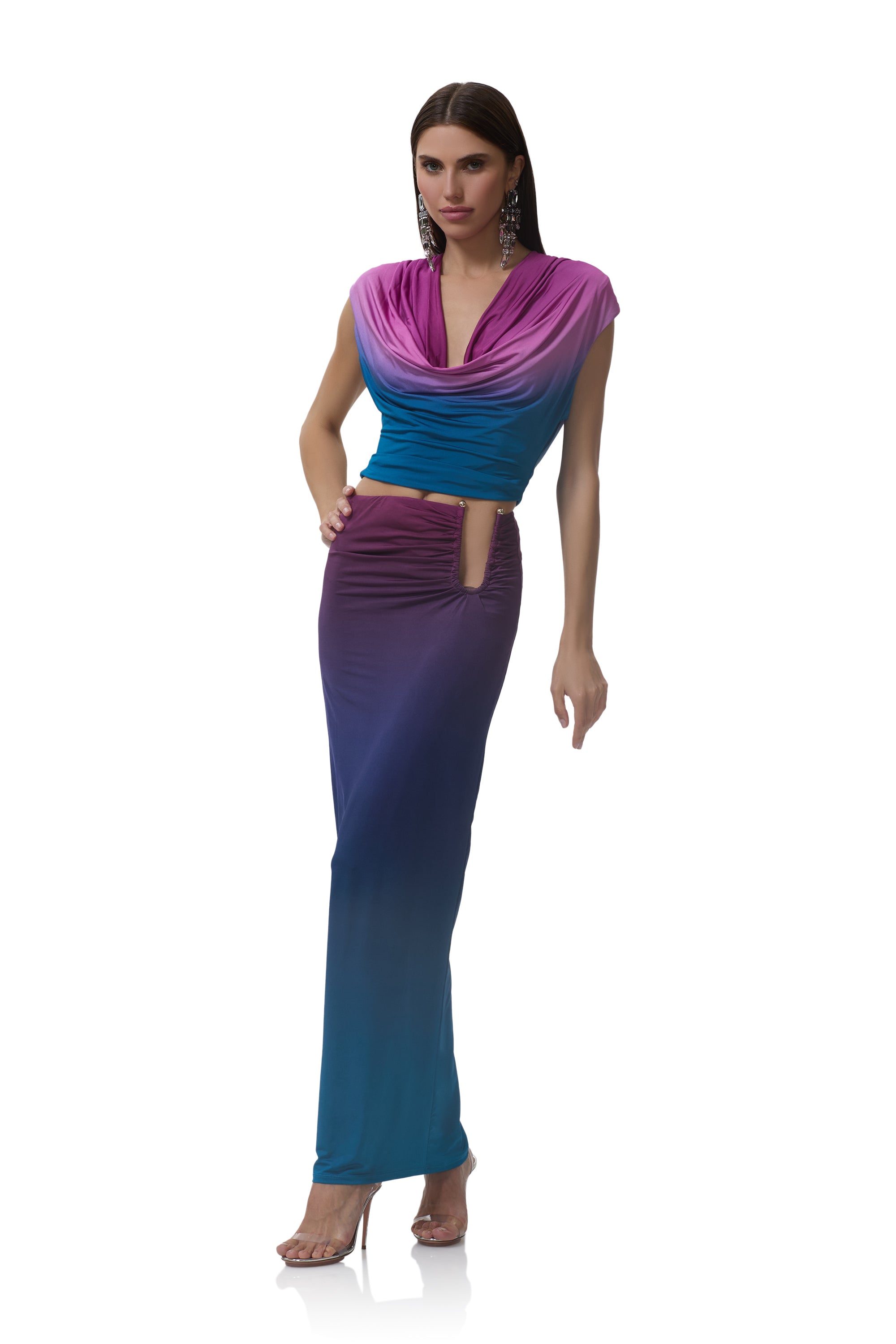 The Aven Skirt is made for warm nights, ocean breezes, and plans that stretch past sunset. Designed in our Midnight Ombre print, this hardware maxi skirt has a sleek, body hugging silhouette and features a bold cutout detail that adds just the right amount of skin. Pair it with the matching Dexter Top for a striking set that feels elevated, effortless, and ready for getaway moments.