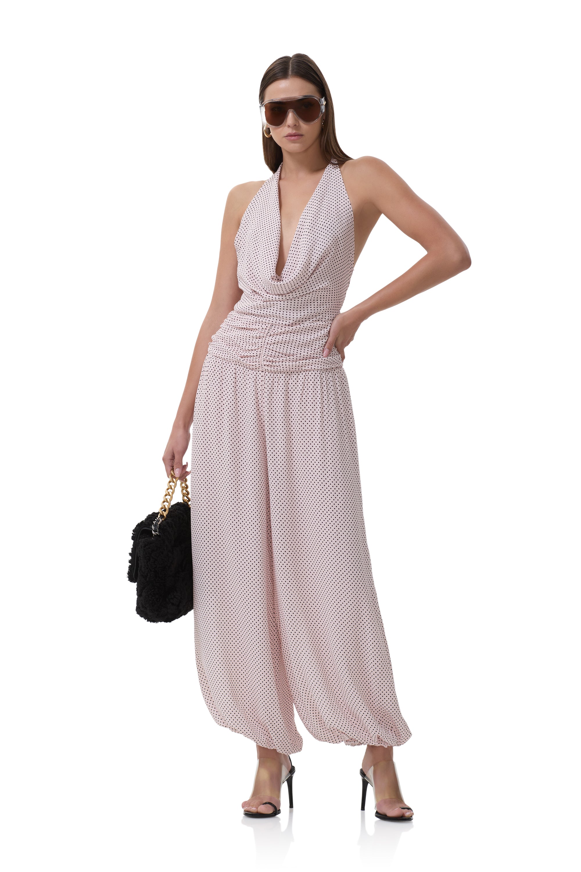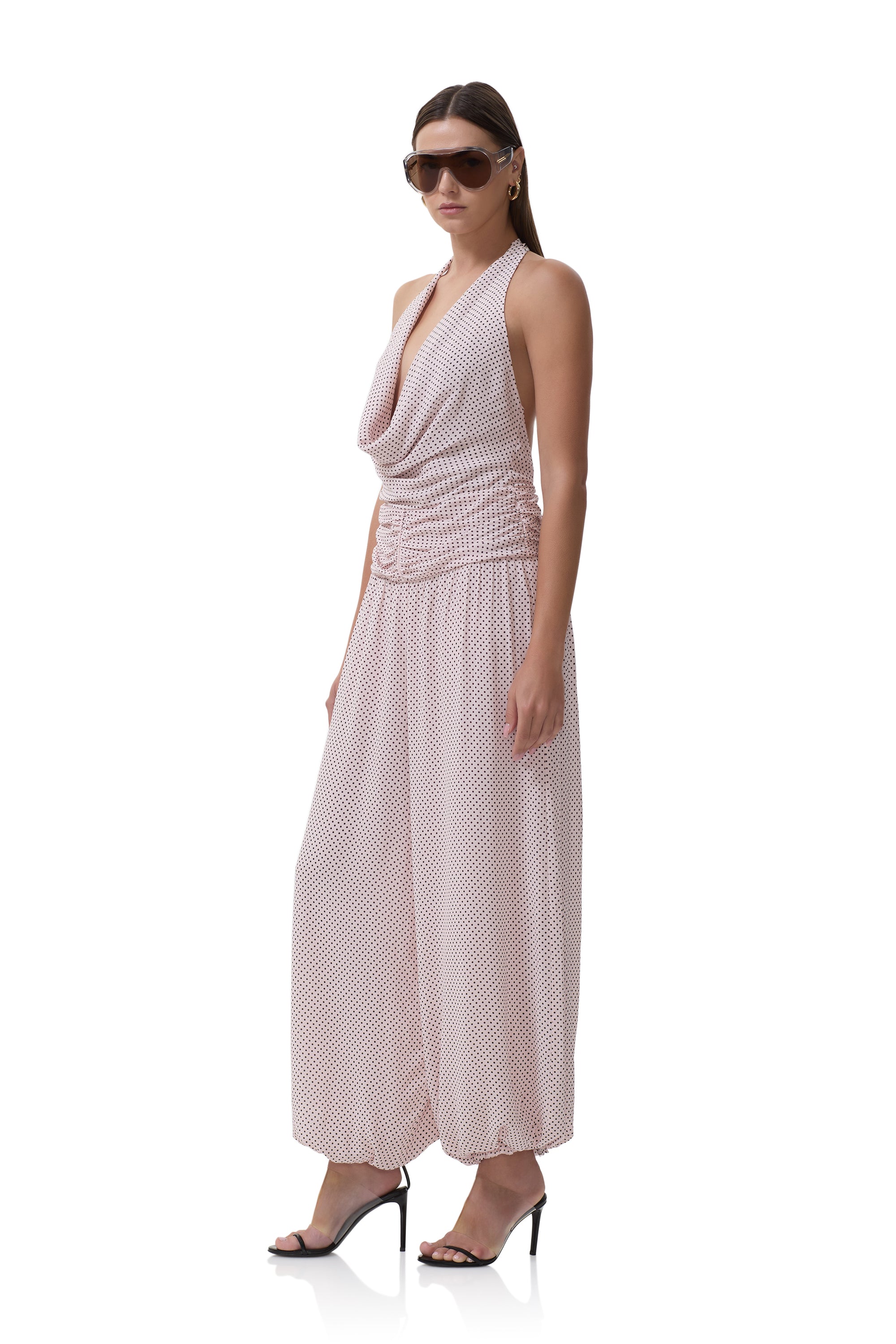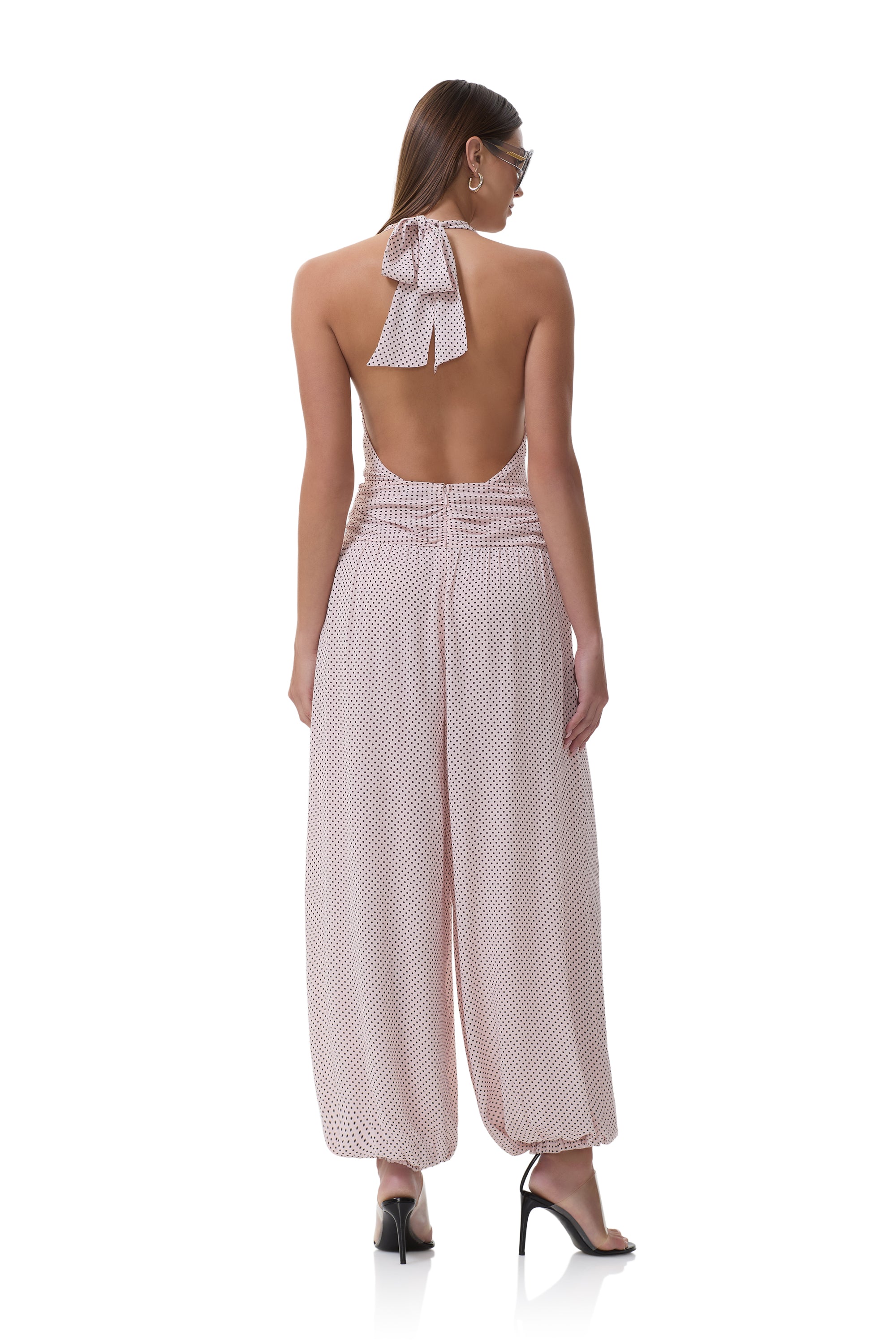 Turn heads in Robin, the jumpsuit that’s equal parts romantic and daring. With a plunging neckline, halter tie detail, and flowing balloon leg silhouette, she exudes effortless edge and evening ready glamour. Debuting in our newest Mauve Pin Dot print.