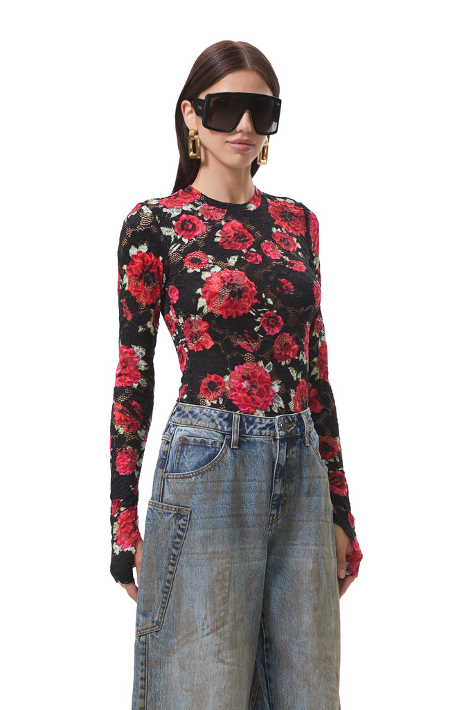 A new take on the best selling Kaylee top. Introducing one of our most-sold styles now available in our romantic crochet lace fabrication. Featuring a crew neck and street-style thumbholes that lend an edgy update to off duty style. She comes in Painted Roses.
