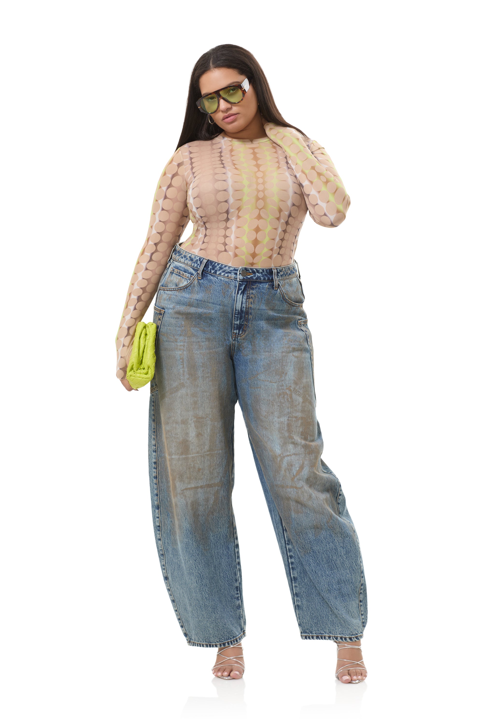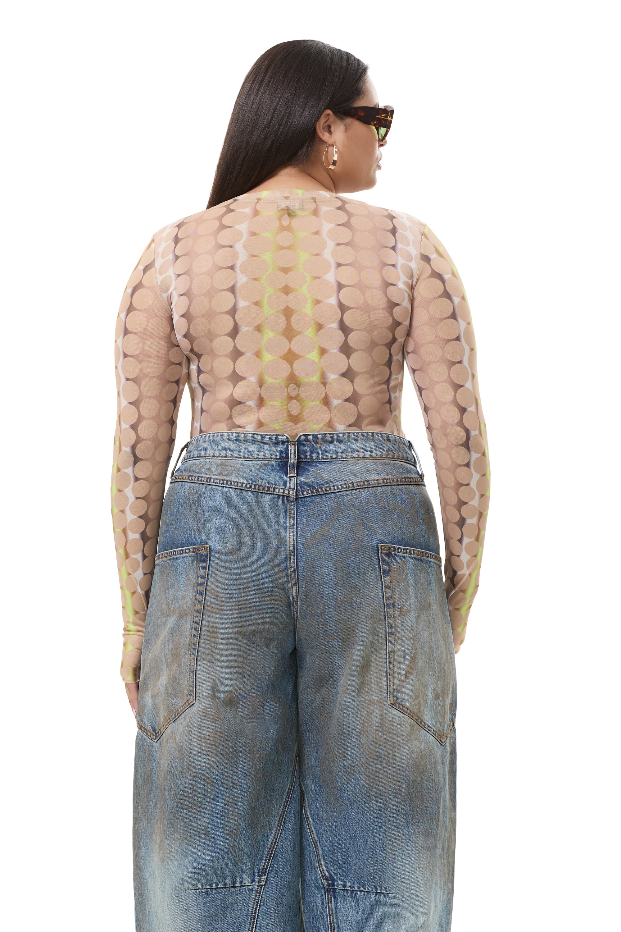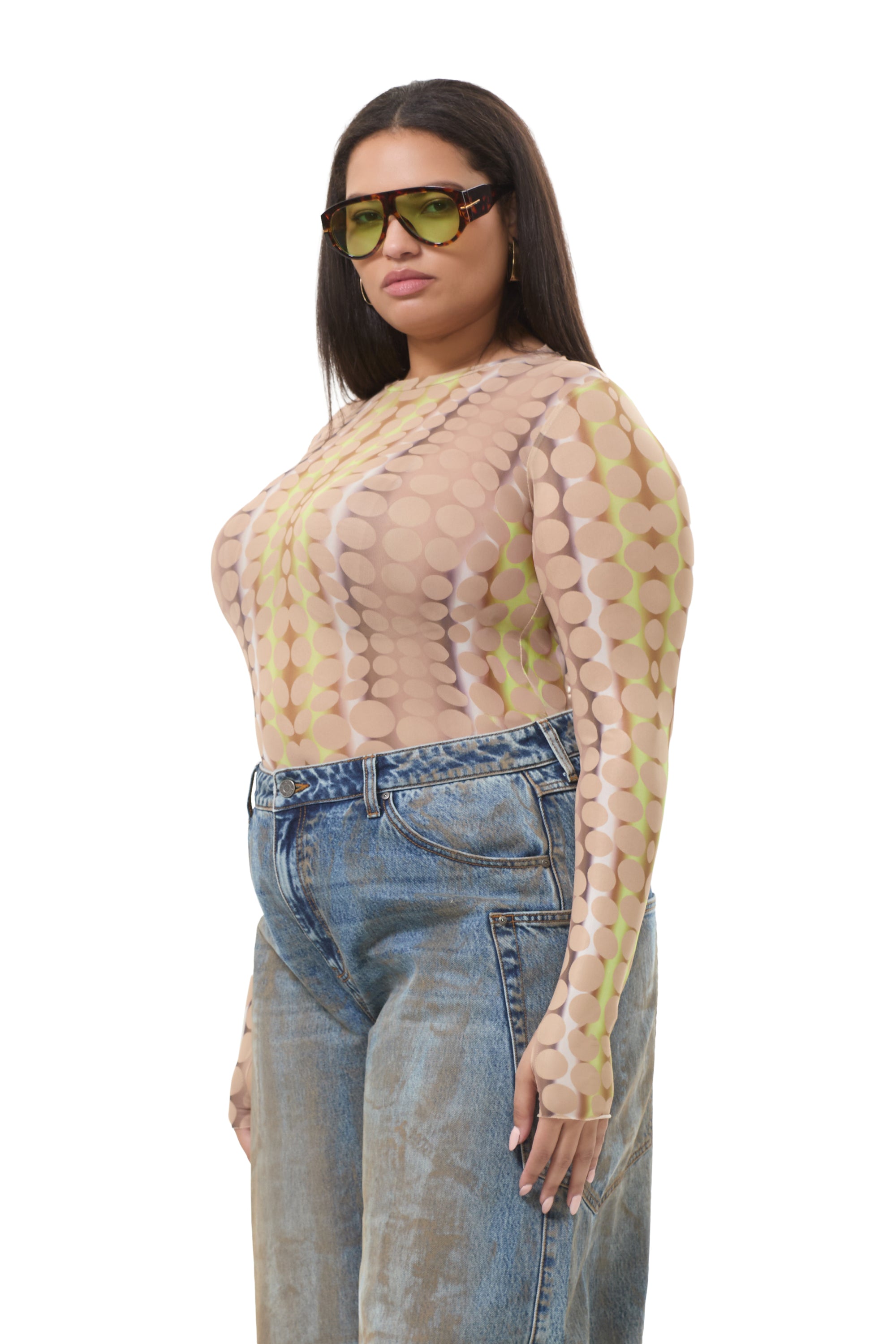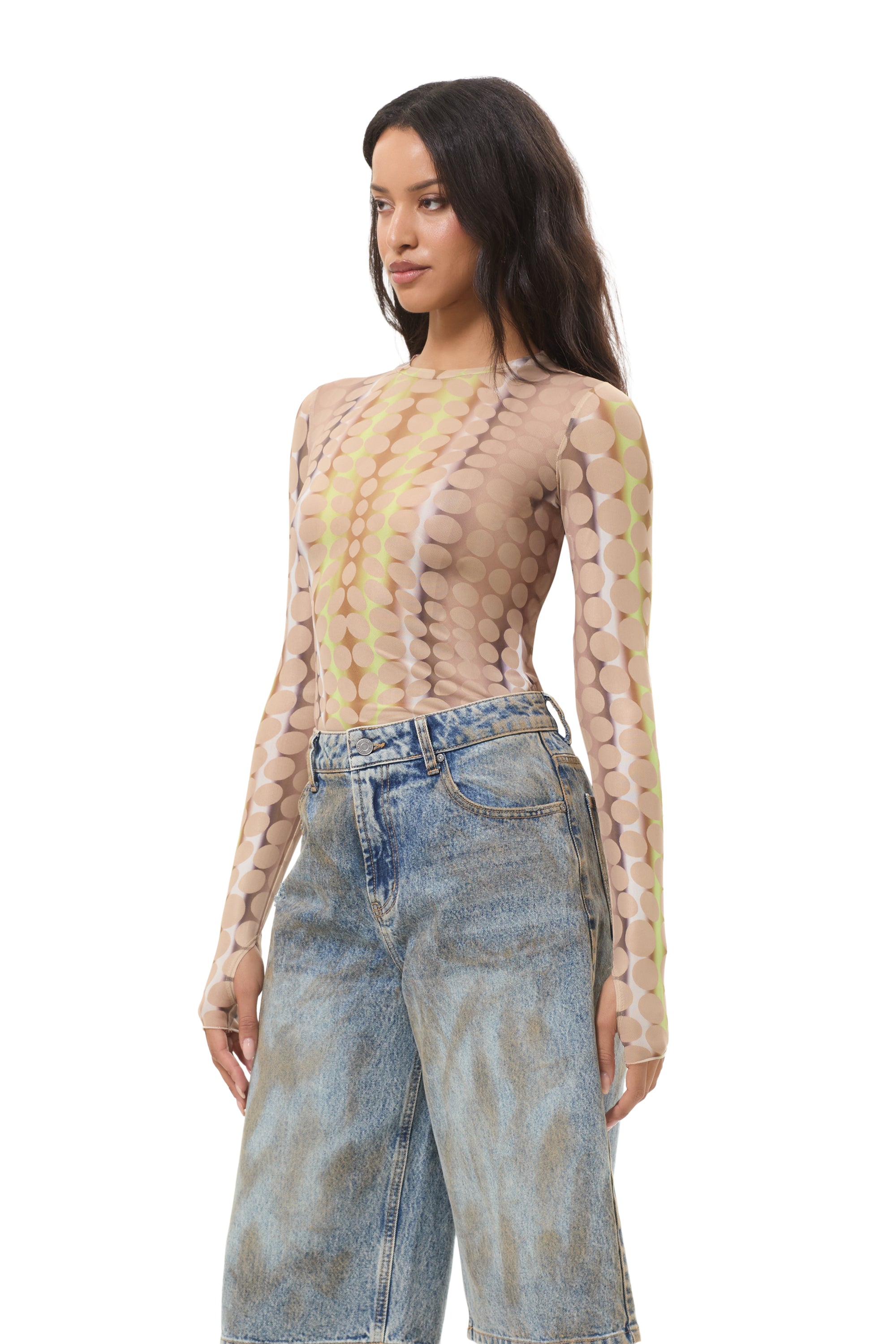 The Kaylee top features a sheer mesh material, crew neck and street-style thumbholes that lend an edgy update to off-duty style. She comes in Tonal Dot.