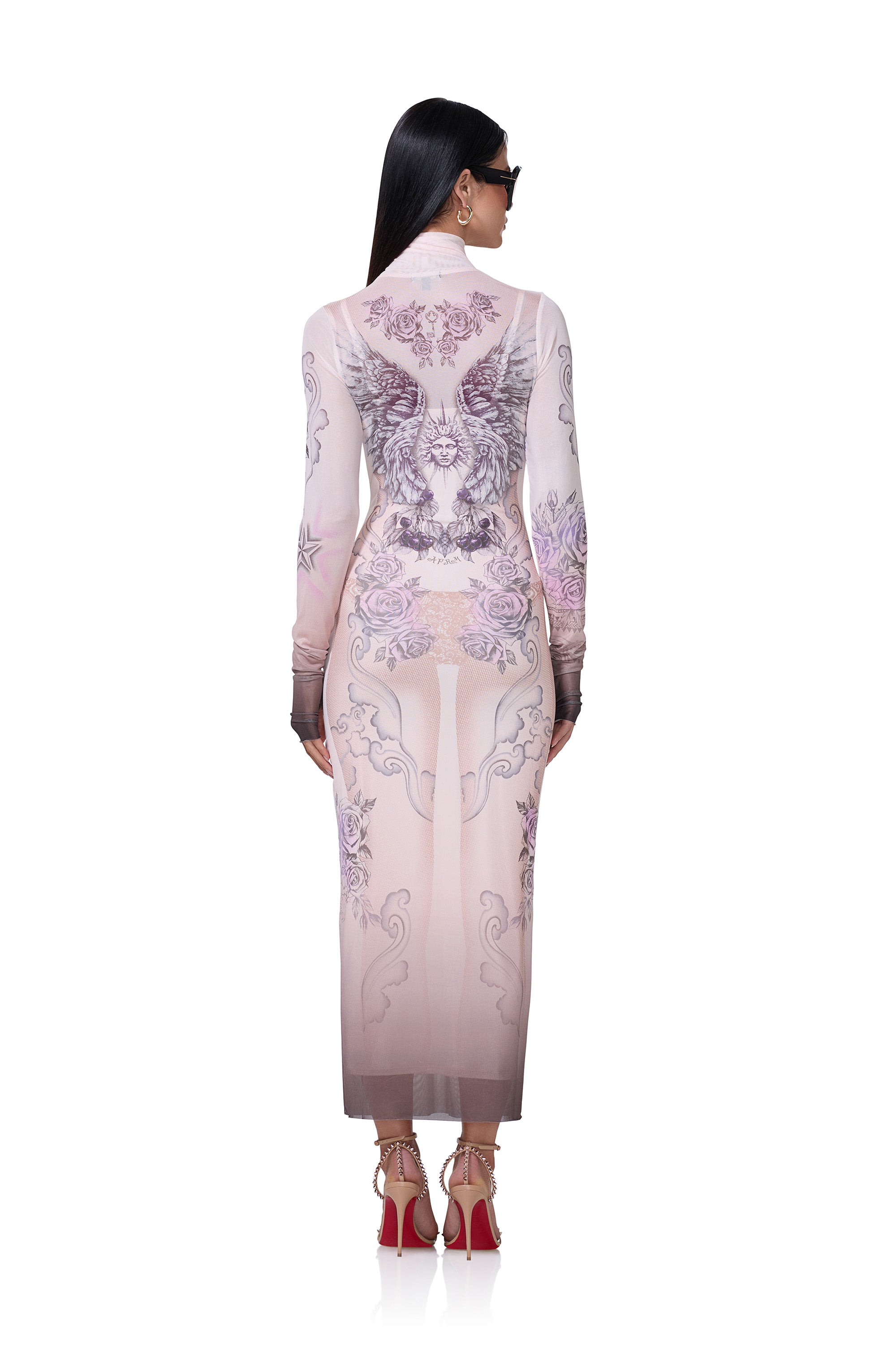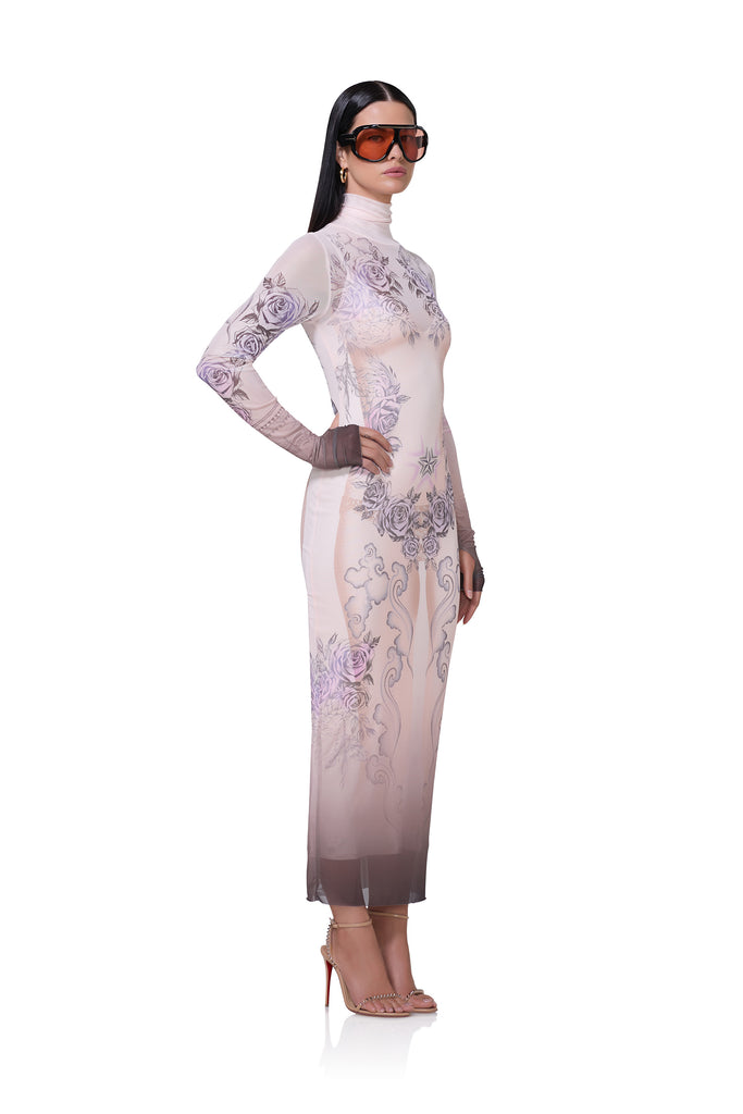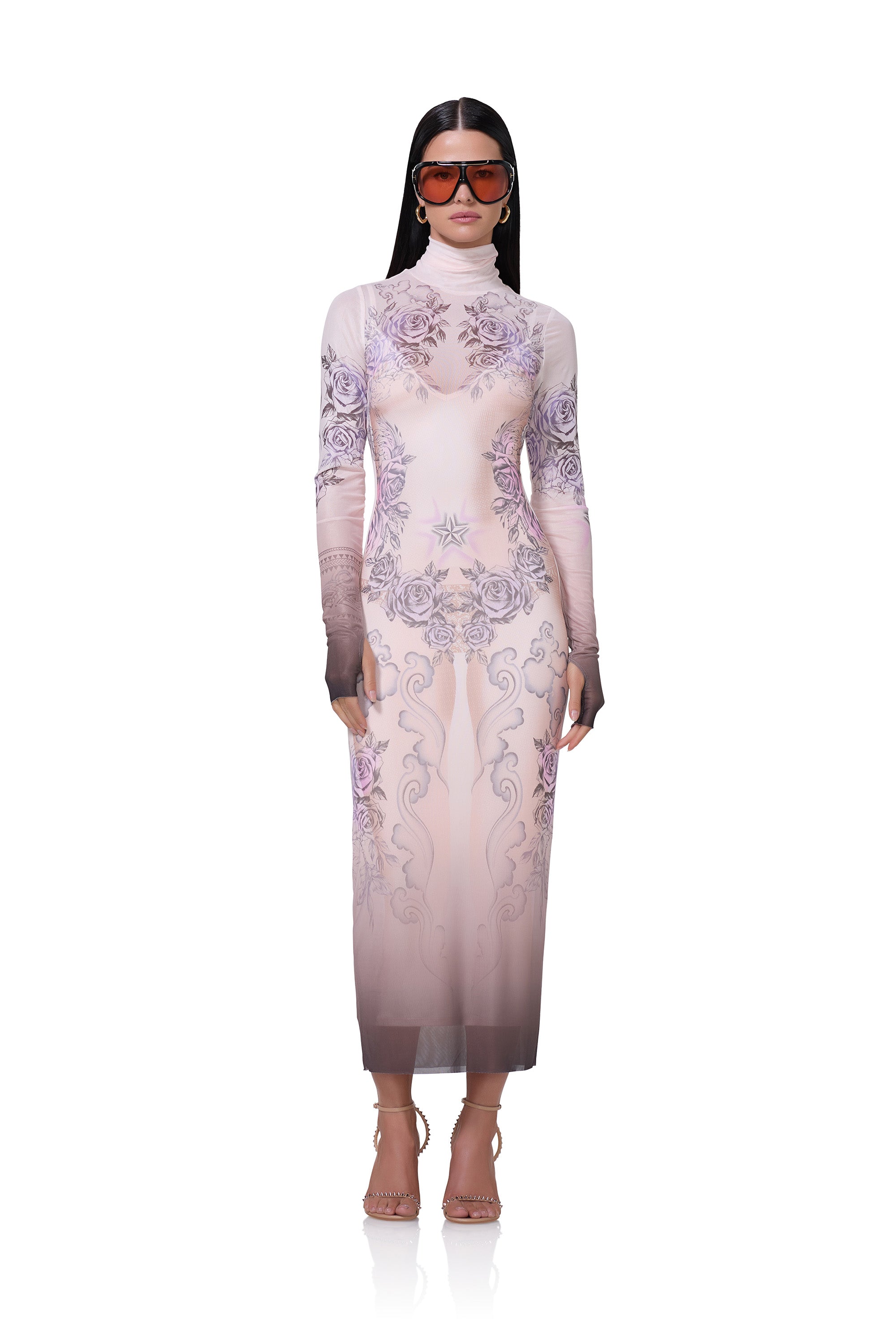 In a sheer power mesh in Lilac Tattoo, the Shailene dress features a turtleneck and fitted midi silhouette. Her sleeve thumbholes add off-duty detail, and she comes in a pullover design that includes a removable slip.