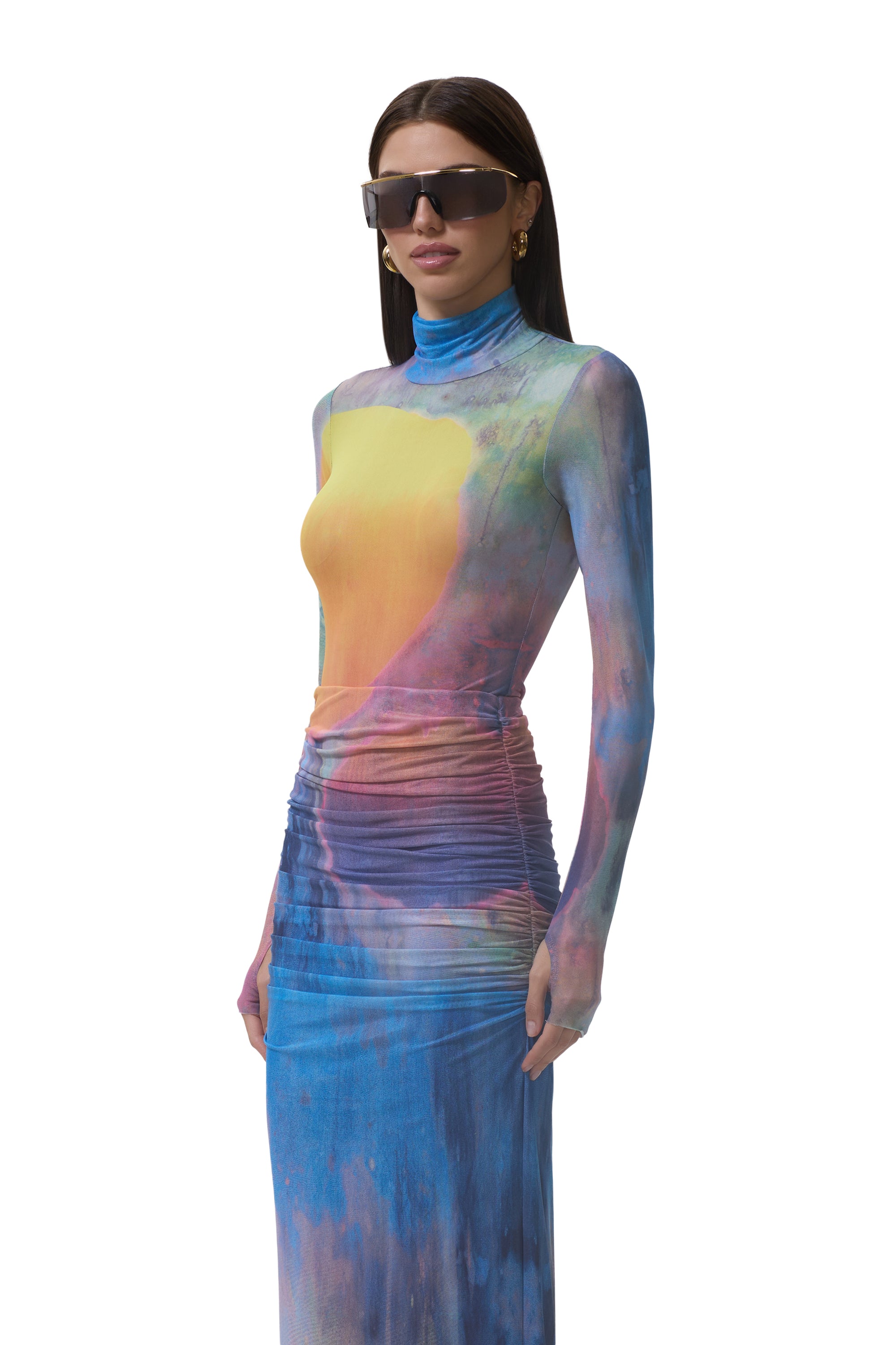 The Zadie top features a sheer mesh material and street-style thumbholes that lend an edgy update to off-duty style. She comes in Midnight Dot.